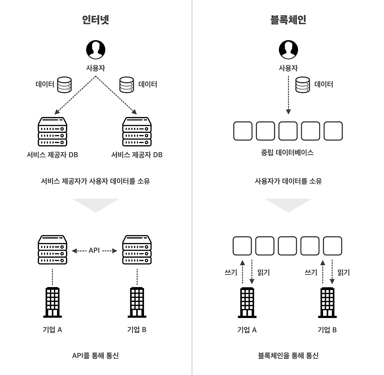 기존의 방식은 기업들이 각자의 독립된 데이터베이스를 운영하고, 사용자의 정보는 각 기업에 귀속된다. 즉 동일한 사용자일지라도, 정보를 기록하는 공간이 분리되어있기 때문에 사실상 다른 정보가 돼버린다. 예를 들어 필자가 페이스북과 트위터에 동일한 글을 올린다고 했을 때, 사실상 동일인물이 같은 콘텐츠를 생산한 것이지만, 시스템 상으로는 다른 주체가 다른 플랫폼에 정보를 입력한 것이다. 따라서 페이스북의 글을 자동으로 트위터에 올리려면 양 사가 통신할 수 있는 API가 존재해야 한다.