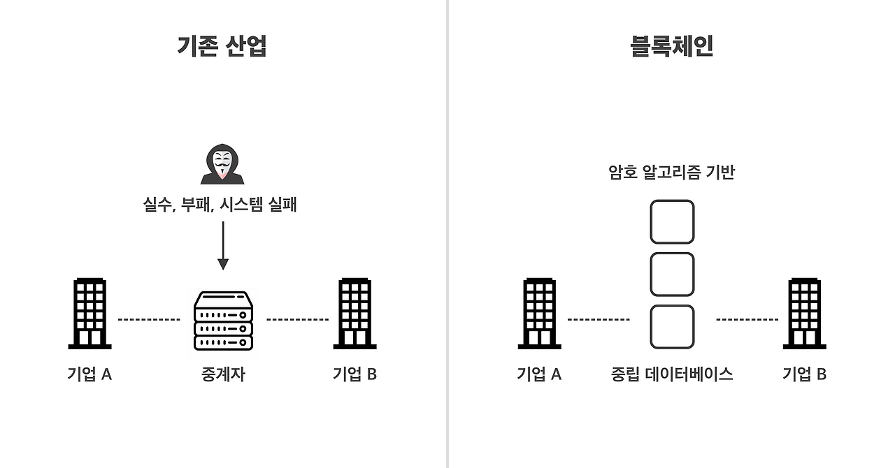 이러한 법적 강제성은 현실에서 100% 작동하지 않는다. 복잡한 산업의 이해관계 속에서 누군가가 이득을 취하기 위해 몰래 정보를 수정하는 사건들은 꾸준히 일어난다. 단순히 데이터 관리직원의 부패함 말고도, 시스템의 실패나 누군가의 실수로 인해 데이터의 정합성이 어긋나는 가능성은 항상 존재한다. 반면 블록체인은 암호학적으로 데이터의 불변성을 보장하기 때문에, 인간의 영역 (부패, 실수, 등)이 존재하지 않는다.