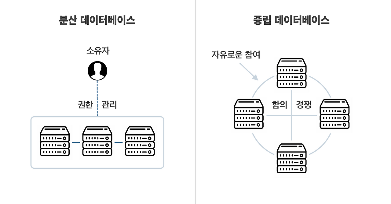 분산 DB와 중립 DB의 극명한 차이는 데이터베이스의 "권한"에서 나타난다. 분산 DB는 하나의 데이터베이스 관리 시스템이 다수의 CPU에 연결된 장치를 제어하는 형태다. 즉 관리자가 존재하는 중앙집중적 방식이며, 관리자가 데이터의 수정과 삭제 권한을 가진다. 공개형 블록체인으로 네트워크를 구현하고 많은 수의 노드를 전세계에 분산시켜 놓았다고 한들, 네트워크의 참여가 자유롭지 않으면 분산DB와 다를바가 없어진다.