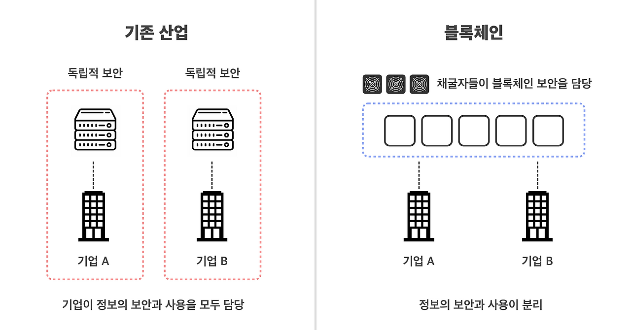 비트코인 블록체인은 보안과 사용을 분리한다. 비트코인 네트워크의 보안을 책임지는 주체는 채굴 자이고, 이 채굴자들은 비트코인이 자금 송금으로 쓰이던, 데이터 사용으로 쓰이던 전혀 상관하지 않는다. 그들은 채굴 보상과 수수료를 통한 수익창출이 목적이다.