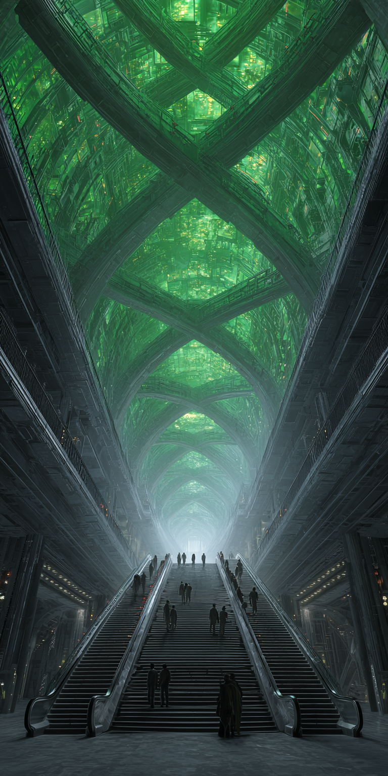 에스컬레이트 주변으로 과거 인류 역사의 갈등 장면들이 핏빛 홀로그램으로 투영되었다. 진우는 극도의 초조함 속에서 주먹을 꽉 쥐었다. 그 장면들은 그가 '자아 완성' 과정에서 고찰했던 '오류의 역사' 그 자체였다.