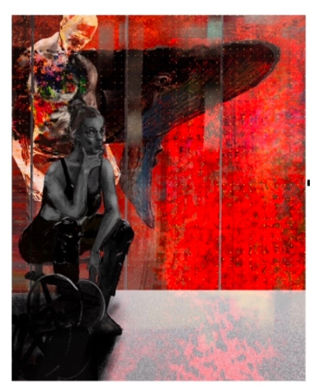 여성 뒤편, 혹은 그녀의 상부에서 희미하게 드러나는 남성의 실루엣은 다채로운 색채와 파편화된 형태로 표현되어, 정체성의 혼란이나 혹은 내면의 또 다른 자아, 또는 사라져 가는 인간의 본질을 상징합니다. 이는 주체(여성)와 객체(남성 실루엣), 혹은 슬픔과 기쁨, 고통과 초월 같은 대립적 요소들의 상호 관계성을 시각적으로 연결하는 역할을 합니다.