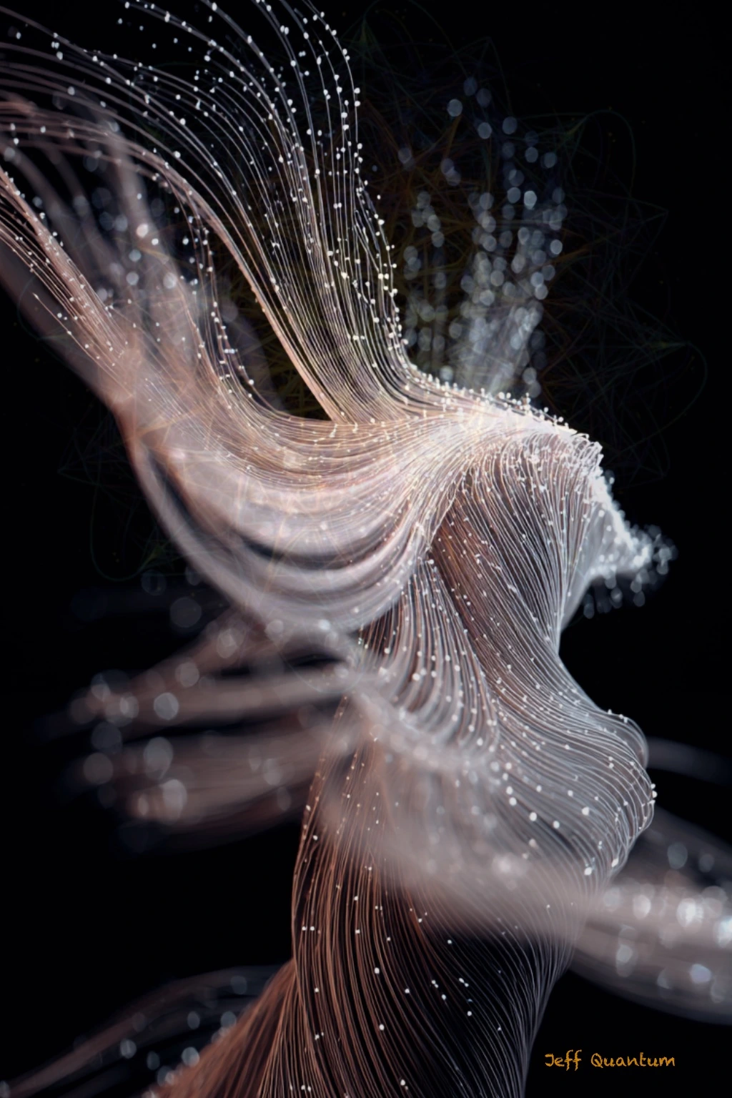어두운 공간, 그 속에서 빛을 머금은 가느다란 선들이 반복적으로 퍼지고 있다.