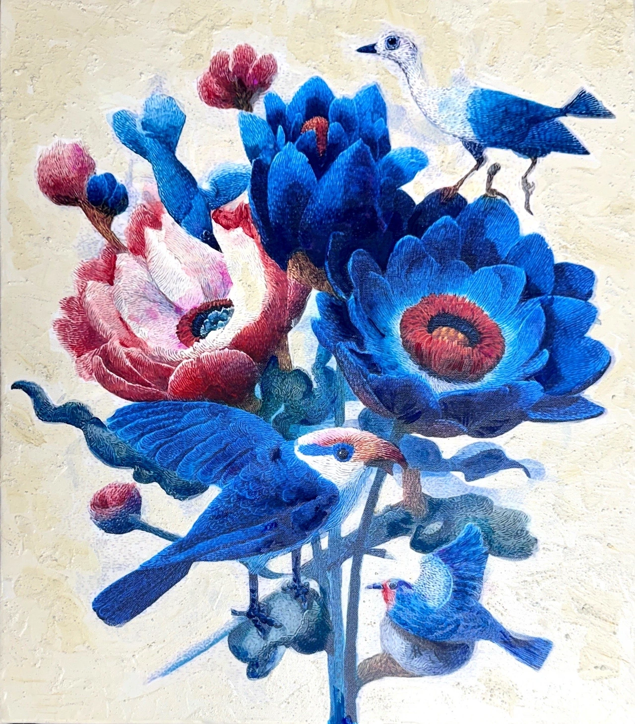 마치 푸른 꿈속을 헤매는 듯한 신비로운 경험이다. 푸른 꽃잎의 깊은 심연 속으로 빠져들고, 푸른 새들의 맑은 눈빛을 들여다본다. 그림 속의 세상은 고요하지만, 그 안에는 강렬한 생명력이 '펄떡'이고 있다.