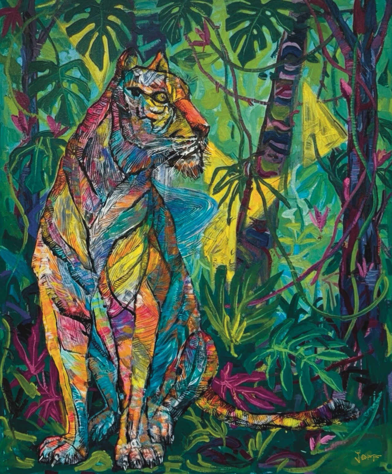 그림의 구성은 호랑이의 압도적인 존재감과 배경의 동적인 리듬에 초점을 맞춘다. 호랑이는 화면 중앙에 굳건히 앉아 위엄과 고독을 드러낸다. 복잡한 선과 고밀도의 색채 덕분에 호랑이는 배경과 뚜렷하게 구별된다. 배경인 정글은 깊은 녹색과 어두운 색조로 처리되어, 호랑이의 밝고 강렬한 색상을 돋보이게 한다. 어둠 속에서 번쩍 튀어나오는 듯한 밝은 노란색 터치는 화면에 긴장감을 자아낸다. 전체 색채가 선의 리듬을 따라 꼬물꼬물 변화하며 혼란 속의 조화를 이룬다.