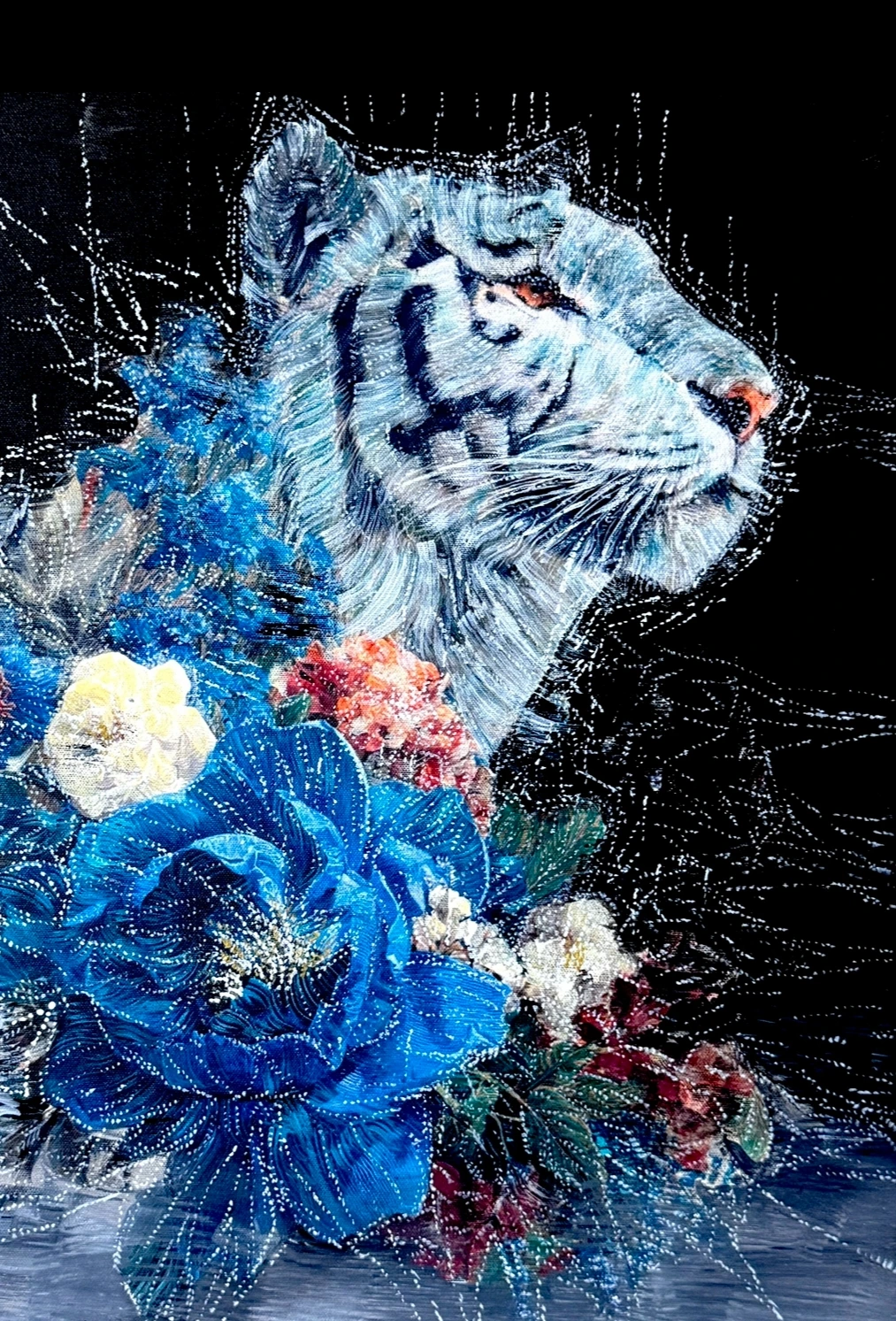 호랑이 털을 묘사하는 선의 움직임은 의도적으로 흔들리고 흐트러진다. 이는 불확정성의 표현이다. 위치가 정확하면 운동량이 불분명하듯, 강력한 푸른빛의 털들은 스르륵 미끄러지며 불분명한 경계를 만든다. 마치 실타래가 사르륵 풀리듯, 존재의 경계가 유연하게 이어지며 호랑이가 있음과 없음의 경계 사이에서 간질간질 떨고 있는 듯한 느낌을 부여한다.