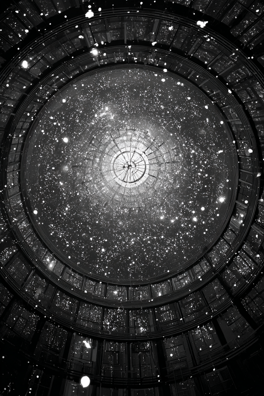 천장이 아주 높아 마치 투명하게 뻥 뚫려 하늘을 향해 열려있는 듯한 넓은 공간. 거실 벽면에는 고대 석궁전, 석등, 화석상들이 고정된 장치 뒤에 숨어 있었다. 구름 같은 천으로 된 대형 커튼 뒤로는 '필름의 바다'가 아른거렸고, 모형 우주인 상은 때로는 우주인으로 화현이 가능한 듯 섬뜩하게 서 있었다. 그리고 한 번도 열리지 않았다는 정원으로 향한 폐쇄된 문... 그 안은 오색의 빛이 가득하고, 교신하며 춤추는 나무와 거석들이 가득한 빛들의 공간이었다.