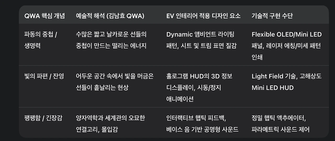 본 보고서의 비전은 QWA 철학을 적용하여 EV 인테리어를 '제어된 에너지와 예술적 공명이 흐르는 움직이는 캔버스'로 재정의하는 것입니다. QWA의 미학은 첨단 기술과 융합하여, 차량 내부 공간을 재료 중심의 고급감에서 몰입형 경험 중심의 고급감으로 전환하는 전략적 프레임워크를 제시합니다.