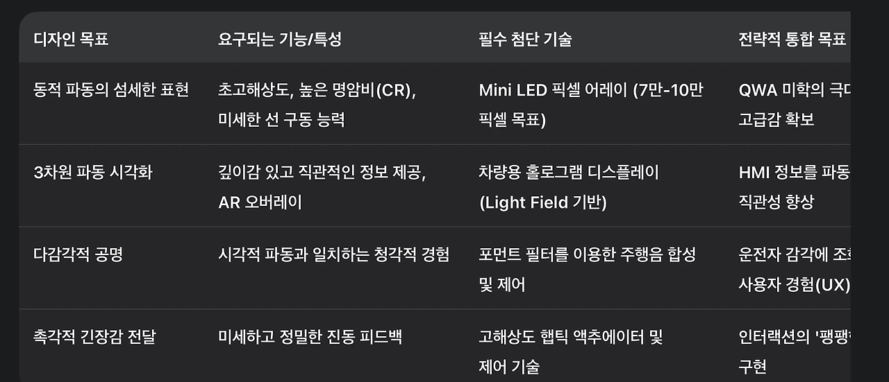 이를 실현하기 위한 구체적인 제안은 QWA 기반의 양자 공명 HMI (Quantum Resonance HMI, QR-HMI) 시스템 구축입니다. QR-HMI는 QWA의 예술적 파동 원리를 시각, 청각, 촉각 등 다감각적 요소에 통합하는 것을 목표로 하며, 이는 첨단 홀로그램 디스플레이 , 고명암비 Mini LED 라이팅 , 그리고 차량 상태에 따라 베이스 음과 포먼트 필터를 합성하여 주행 음을 제어하는 파라메트릭 사운드 제어 기술 의 전략적 통합을 통해 구현됩니다.