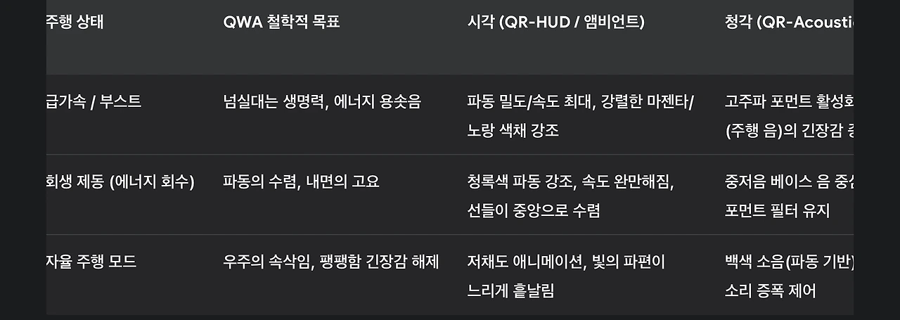 2) 파라메트릭 사운드 동기화: 차량 상태에 따른 베이스 음 선택 및 포먼트 필터 합성을 통한 주행 음 제어 기술 을 QWA 파동 알고리즘과 완벽하게 동기화하여 청각적 몰입감을 확보해야 합니다.
