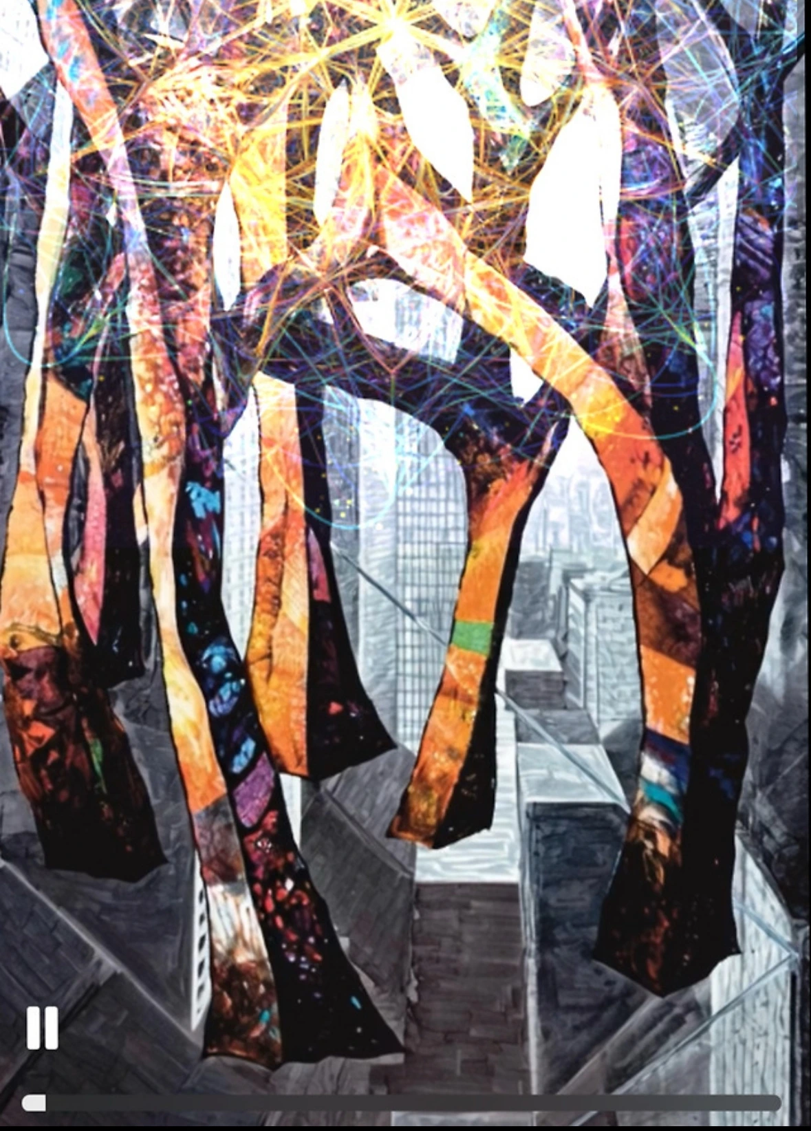 자세히 보면, 이 나무들은 명확한 실체가 아니다. 그들의 형태는 파르르 떨리며, 도시의 배경 위를 끊임없이 맴도는 듯하다. 양자역학에서 말하는 '중첩의 상태'가 바로 나의 미학적 핵심이다. 이 나무들은 존재의 경계에 아슬아슬하게 걸쳐 있다.
