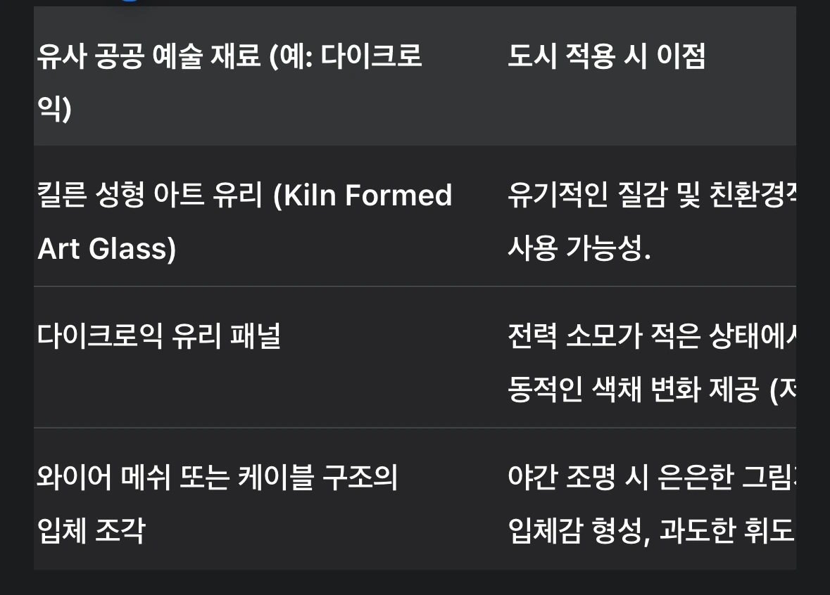 다이크로익 유리(Dichroic glass)는 보는 각도, 태양의 각도, 또는 조명의 위치에 따라 색상이 끊임없이 변화하는 특징을 가진다. 공공 예술 프로젝트 사례인 Leading Lights와 같은 작품에서는 다이크로익 유리 패널을 사용하여 낮에는 자연광을 반사시키고, 밤에는 솔라 파워 조명을 이용해 은은하게 발광하는 '보석 같은' 기둥을 조성했다. 이러한 소재는 주야간 시각적 영향력을 동시에 창출하며, 최소한의 인공조명만을 요구하여 빛공해 규제 준수에 매우 유리하다. 특히 다이크로익 소재는 과도한 빛을 방출하지 않고, 주로 반사(Reflection)와 간섭(Interference)을 통해 색채 변화를 유도하는 저에너지 동적 효과를 구현한다.