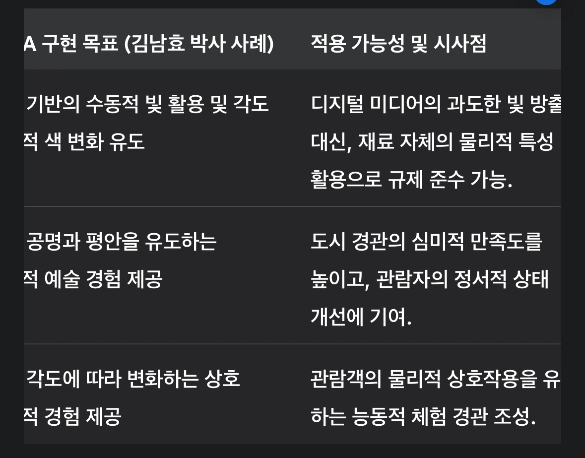 양자파동아트(QWA)는 도시 야간경관 관리의 규제적, 심미적 요구를 동시에 충족시키는 혁신적인 대안으로 분석된다. 기술적으로 QWA는 김남효 박사 사례에서 나타난 바와 같이 저에너지, 저휘도 물성 기반의 동적 효과를 사용하여 「빛공해 방지법」의 규제 프레임워크를 준수할 수 있다. 미학적으로는 양자 역학적 은유와 동양 철학적 조화 를 바탕으로 시민들에게 심리적 안정감과 내적인 공명을 제공하며, 이는 기존 미디어파사드가 야기했던 시각적 공해와 피로를 해소하는 데 기여한다. QWA의 '수동적 동적 건축 예술'로서의 역할은 도시 계획가들에게 지속 가능한 야간 경관을 설계할 수 있는 중요한 정책적 도구를 제공한다.