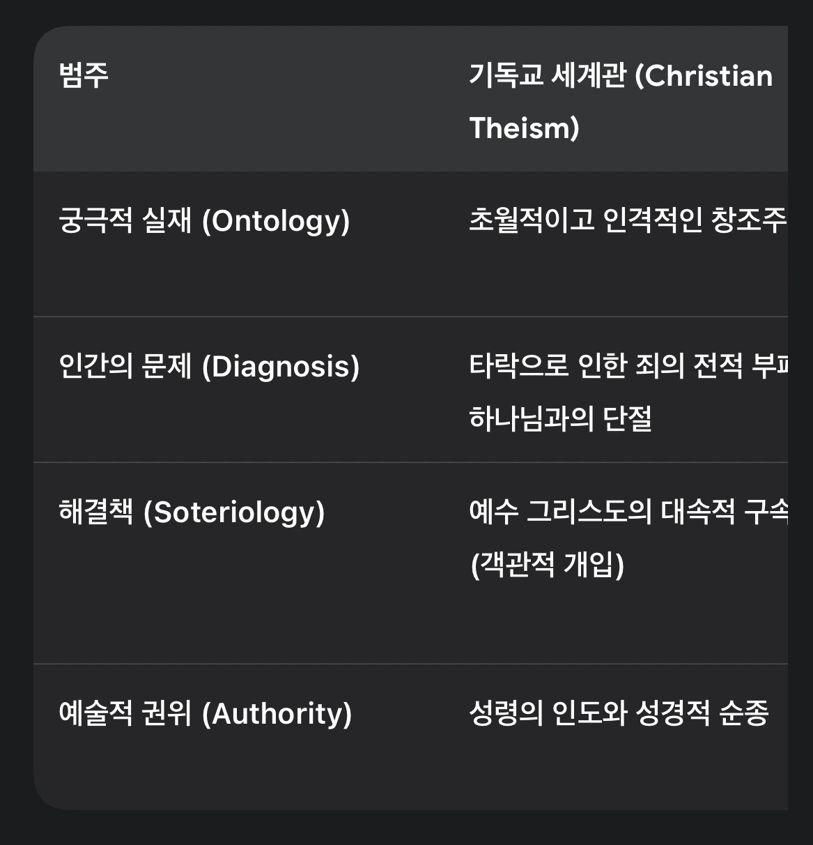 - 기독교 세계관: 성경적 진리를 기반으로 창조(Creation), 타락(Fall), 구속(Redemption), 완성(Consummation)의 거대한 서사를 통해 세상의 기원, 문제, 해결책을 총체적으로 해석하는 관점이다. 이는 초월적 인격신 하나님이 만물의 유일한 근원이라는 전제를 포함한다.
