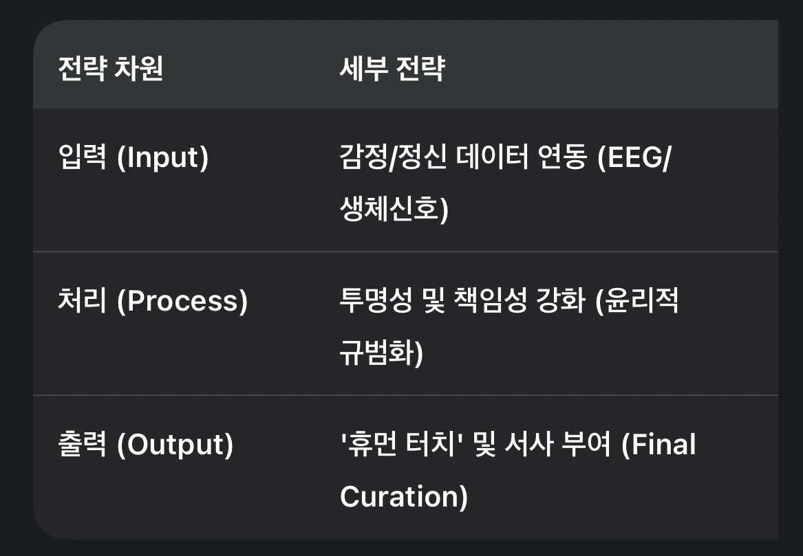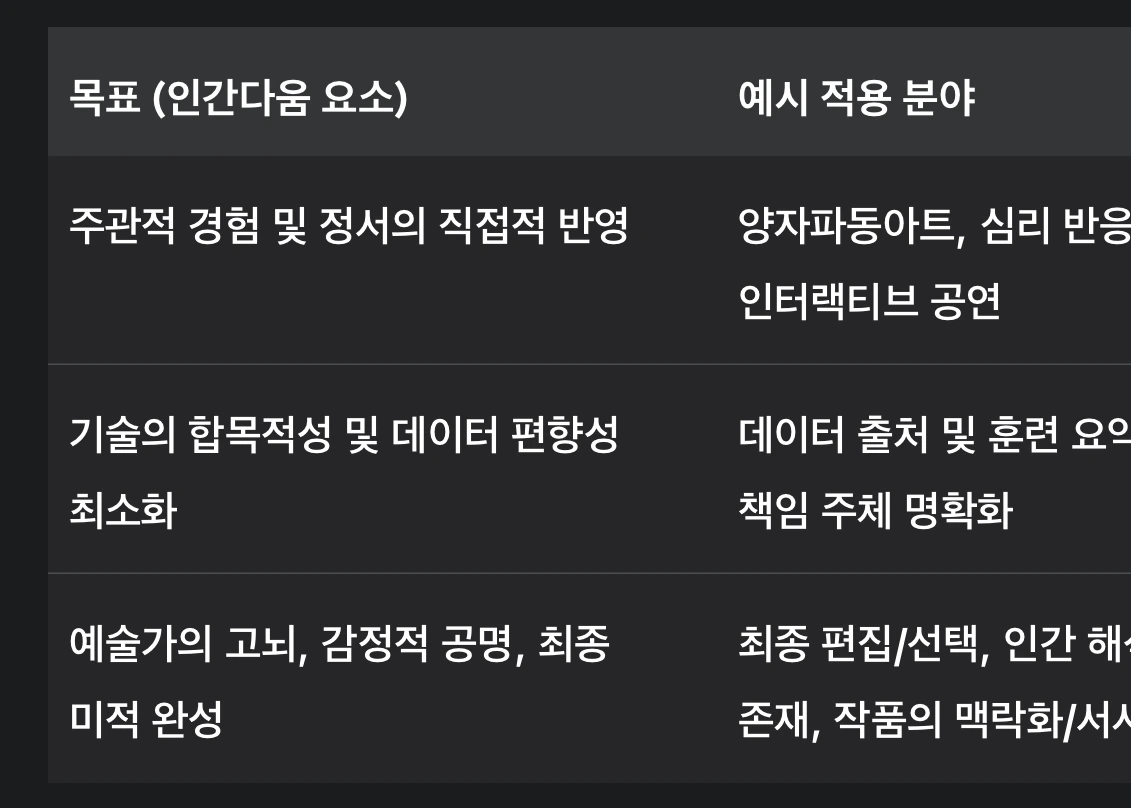 진정한 예술은 인간의 고뇌, 질문, 기억, 그리고 공동체적 감정을 담아야 한다. AI가 데이터를 통해 감정을 정량화하려 하지만, 인간 예술가에게서 나오는 감동의 근원인 '마음(心)' 은 AI가 표현하기 어려운 비정량적인 인간만의 전유물로 남아있다. 따라서 기술은 감동을 '재현'할 수는 있으나, 의미를 '살아낸다'는 것은 오직 인간만이 할 수 있는 예술의 숙명이다. '인간다움' 전략은 AI의 정량적 복제 능력을 넘어선 비정량적 서사를 삽입하는 데 초점을 맞춰야 한다.