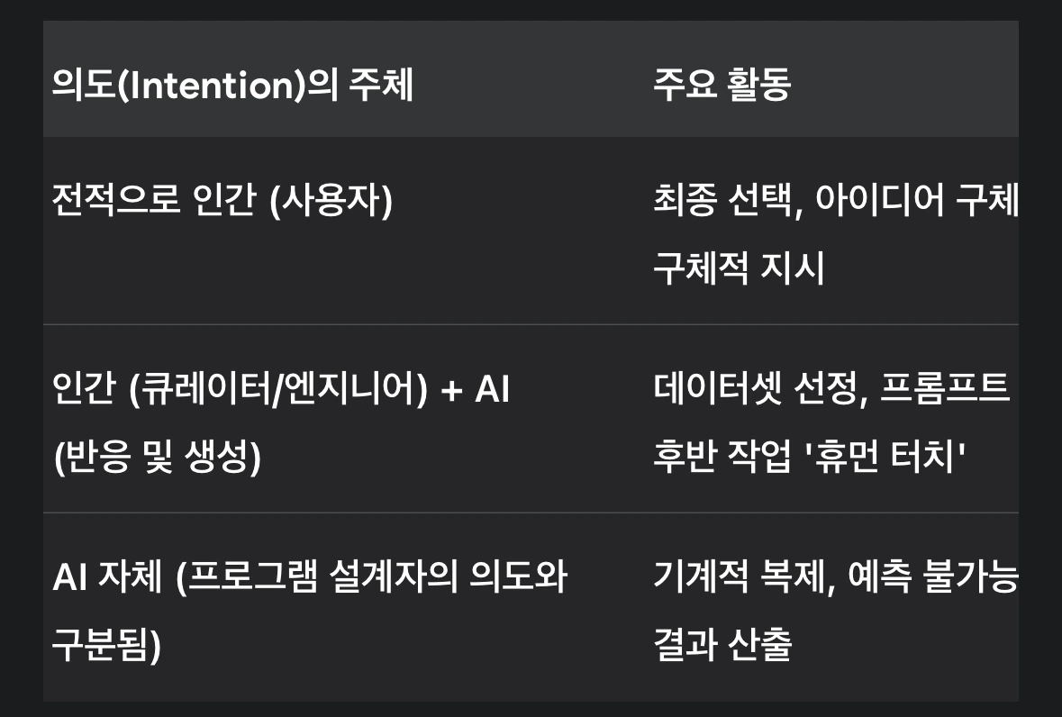 Table 1. AI 창작 과정에서의 '예술적 의도' 주체 비교 프레임워크