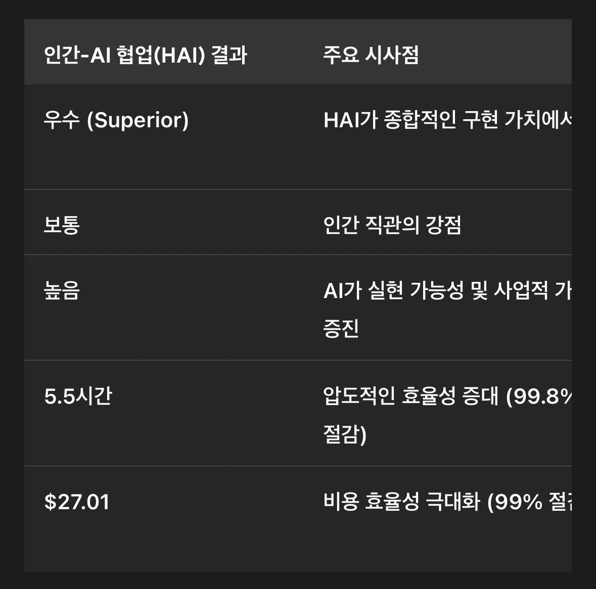 더욱 놀라운 점은 HAI의 효율성이다. 최종 결과물을 도출하는 데 있어 HC 모델이 2,520시간과 2,555 달러를 소요한 반면, HAI 모델은 단 5.5시간과 27.01 달러로 유사하거나 더 우수한 결과를 생성했다. 이는 개발 시간은 99.8%, 비용은 99% 절감한 수치로, AI 증강 방식이 사업적 가치를 지닌 구현 가능한 아이디어를 생산하는 데 극도로 효과적임을 시사한다. 여기서 도출되는 중요한 논점은, HAI 결과물이 참신성(Novelty)에서는 HC보다 낮았지만 전략적 및 재정적 가치에서 높게 평가되었다는 사실이다. 이는 AI가 창작의 도구가 아니라, 아이디어를 '실현 가능성'과 '시장 가치'에 최적화시키는 엔진으로 기능함을 의미하며, 창의성의 초점이 '무엇을 만들까'에서 '어떻게 효과적으로 구현하고 가치를 극대화할까'로 이동하고 있음을 방증한다.