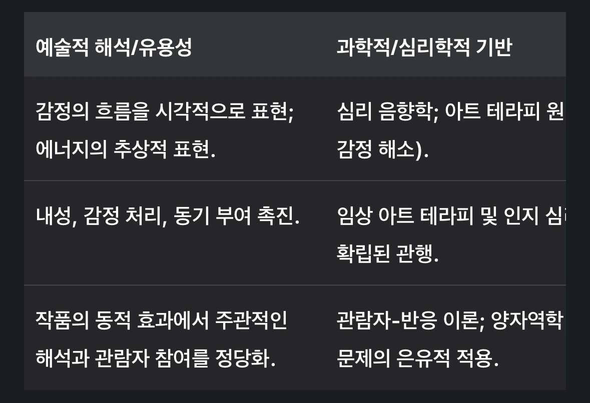 양자 파동 예술(QWA) 모델은 그 지적 유용성이 명확하게 확인된다. 이는 양자 프레임워크가 과학적 주장이 아니라, 창작자의 학술적 정당성에 의해 뒷받침되는 감정의 흐름과 상호작용적 의식을 위한 강력한 심리적 및 예술적 은유로 이해될 때 가능하다. 김남효 박사의 동양화, 디자인, 코칭, MBTI 심리학, 그리고 건축학 박사 학위의 결합은 그의 작업에 깊은 학제 간 토대를 제공하며, QWA가 감정적 복합성을 시각적으로 구현하고 심리적 조절을 목표로 하는 정당한 탐구임을 입증한다.