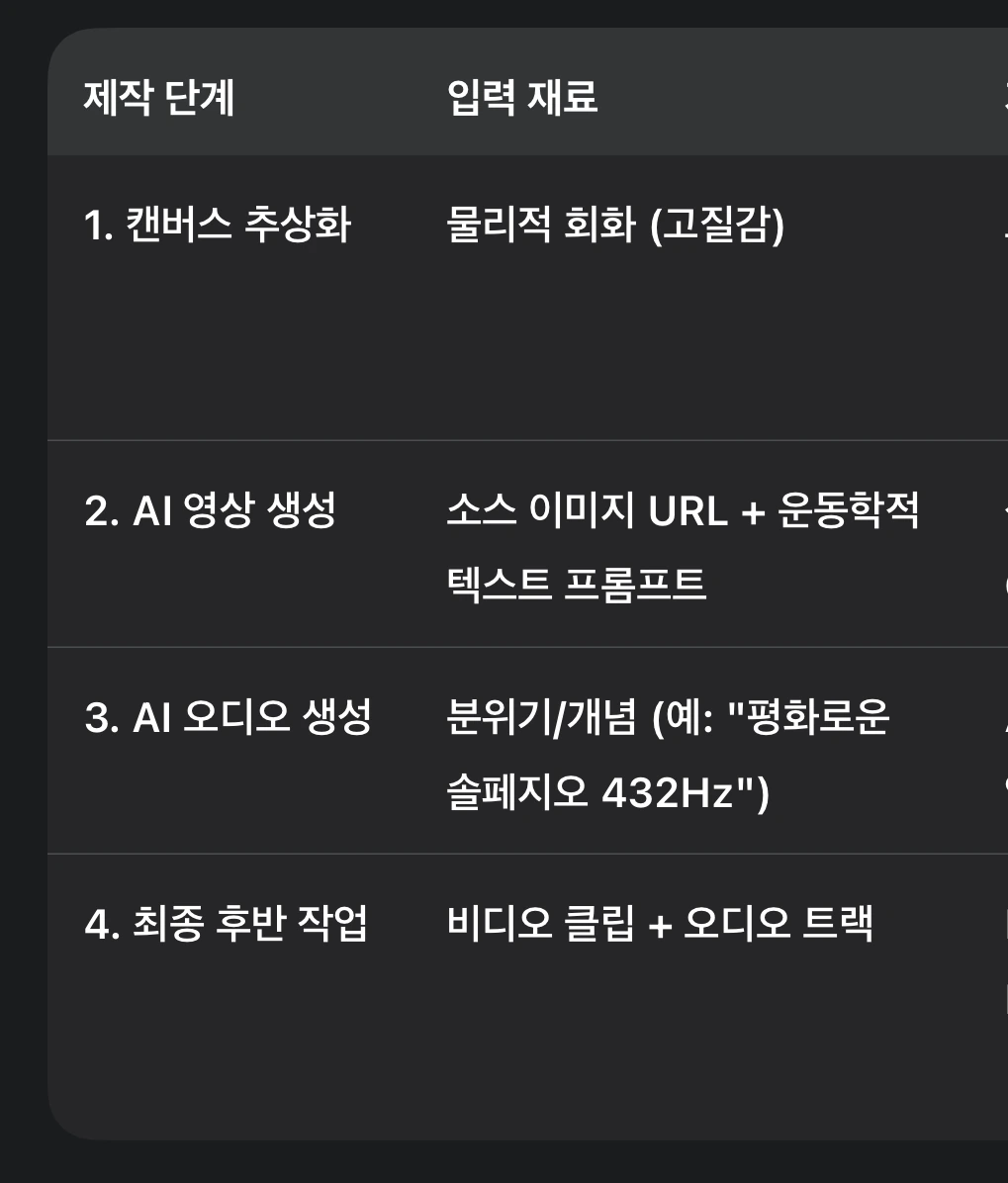 캔버스에서 클라우드로 이어지는 하이브리드 워크플로우는 매우 효율적이며 기술적으로 타당하다. 이 프로세스는 정적인 인간의 예술(캔버스)을 생성형 AI 기술(Midjourney, Canva) 및 정교한 후반 작업 기술(NLE 및 심리 음향학적 오디오) 을 사용하여 확장 가능하고 역동적인 치료적 미디어로 변환한다. 이 방식은 물리적 예술의 고유한 가치(작가성)를 유지하는 동시에 디지털 배포의 요구 사항(동적인 파동 효과 및 무한 루프)을 충족시키는 최적의 모델이다.