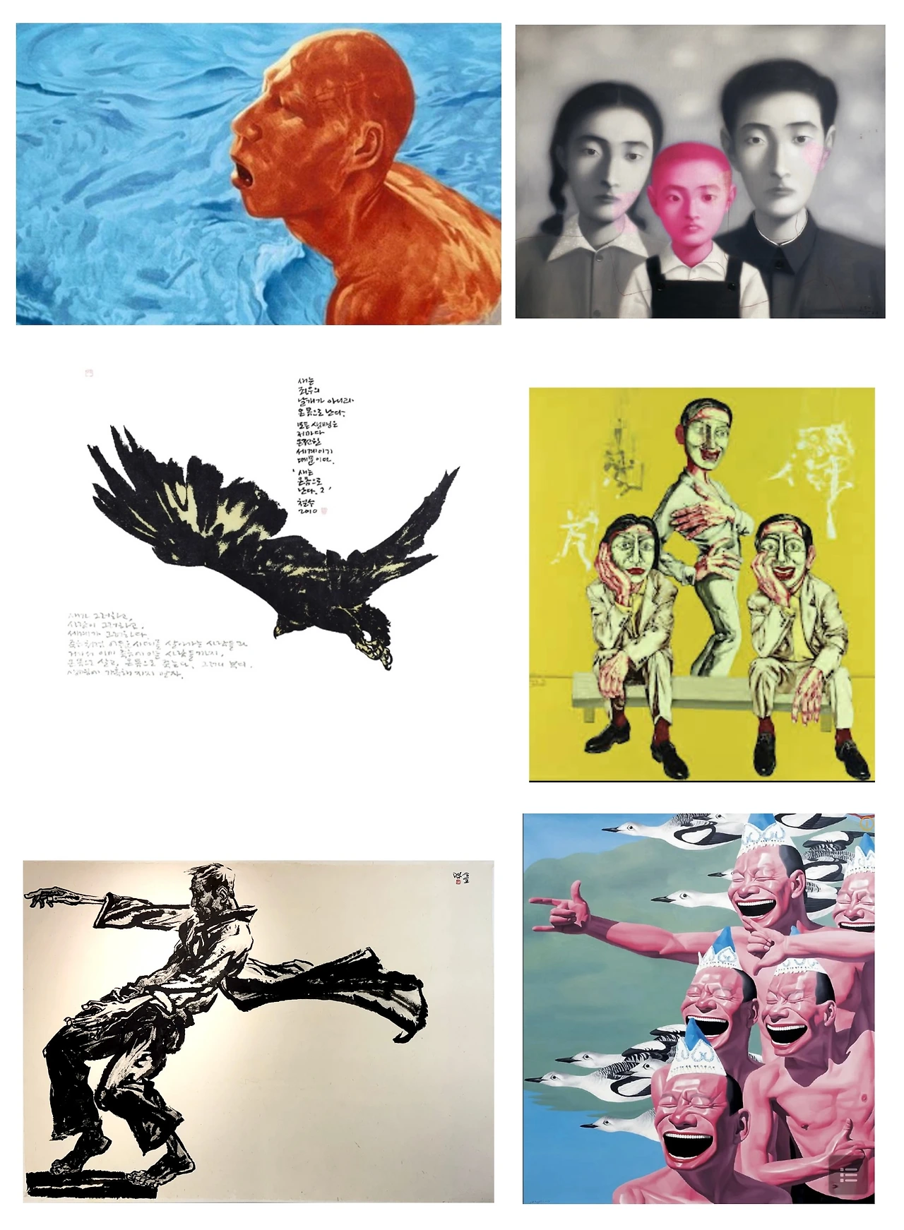중국 현대미술의 경우, 문화대혁명과 개혁개방 노선의 충돌 속에서 1989년 천안문 사태라는 치명적인 정치적 좌절을 경험했다. 이 사건은 젊은 예술가들에게 집단적 행동과 진보적 이념에 대한 회의론을 깊이 각인시켰으며, 이후 중국 현대미술의 주류 담론인 냉소적 사실주의(Cynical Realism)와 정치 팝(Political Pop)의 토대를 마련하였다. 반면, 한국의 경우 1980년 광주민주화운동과 1987년 6월 항쟁으로 대변되는 일련의 민주화 투쟁 과정이 사회 변혁의 실질적인 성과를 도출하면서, 한국 현대미술, 특히 민중미술(Minjung Art)의 직접적이고 참여적인 동력이 되었다.