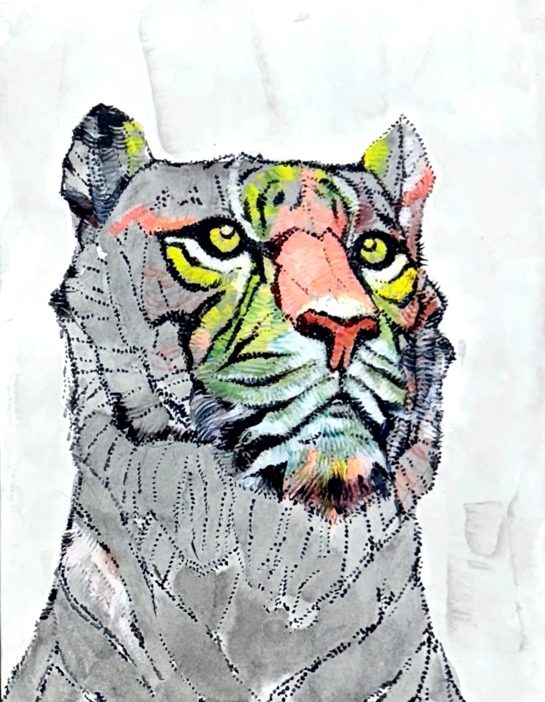 그다음은 색을 입히는 시간이었다. 조심스럽게 붓을 들고 호랑이의 얼굴에 색을 얹기 시작했다. 눈 주변, 코끝, 턱선… 감정이 가장 응축된 곳들에만 톡, 톡— 색을 얹었다. 노란색이 스며드는 순간, 그 점은 더 이상 회색빛의 가능성이 아닌 ‘노란색’이라는 확정된 존재가 되었다. 마치 양자 중첩이 해소되는 순간이다.