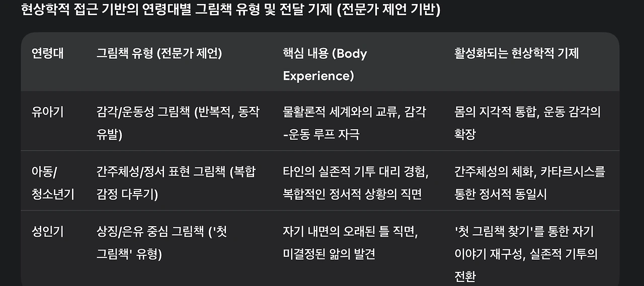 그림책은 독자에게 '접촉'과 '변화'를 유발하는 실존적 에너지와의 연결고리를 제공해야 한다. 유아에게는 즉각적인 신체 반응을 유도하는 그림책, 청소년에게는 깊은 정서적 동일시를 일으키는 간주체적 메타포를 담은 그림책, 그리고 성인에게는 자신의 오래된 몸틀 이야기와 실존적 기투를 투사할 수 있는 은유 중심의 '첫 그림책' 유형이 효과적이다.