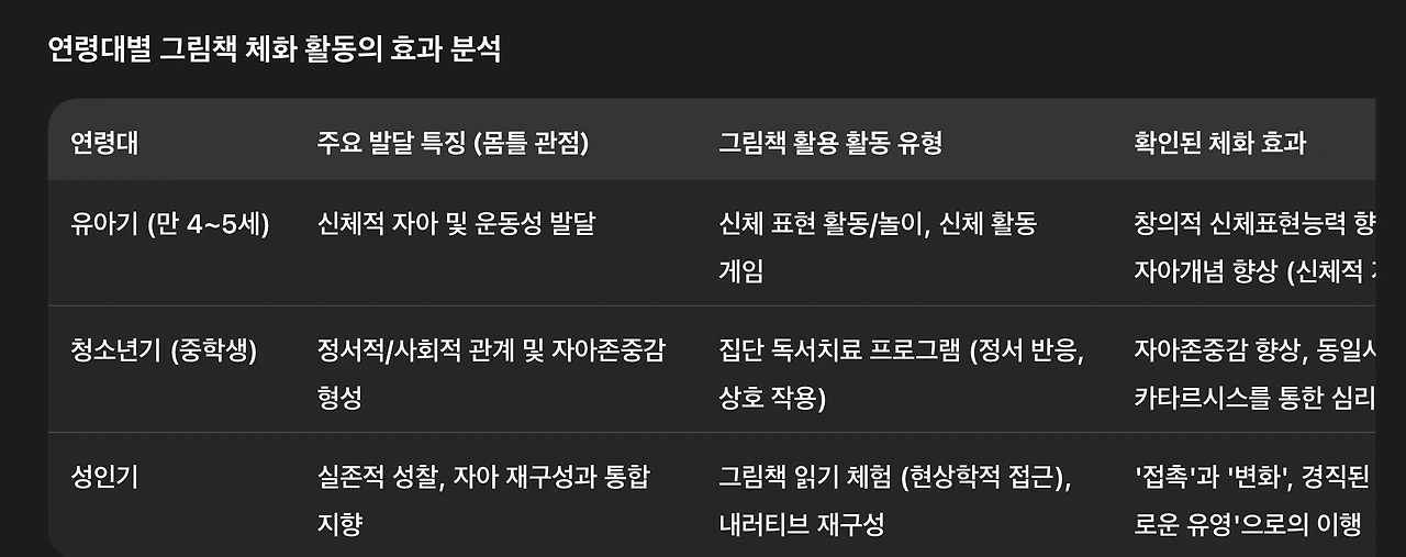 유아기에는 신체적 자아와 운동 능력의 발현을 통해 존재의 기초를 확립하며, 청소년기에는 간주체적 공명을 통해 정서적 동일시와 카타르시스를 경험한다. 성인기에는 '첫 그림책 찾기'와 같은 성찰적 과정을 통해 경직된 몸틀을 이완시키고 '접촉'과 '변화'라는 근본 속성을 통해 실존적 통합을 이룬다. 전 생애적 발달 단계에 따라 체화의 초점은 변화하지만, 그림책이 독자에게 이전에 경험하지 못했던 새롭고 경이로운 'Aha’ 경험'을 유도하는 근본적인 원리는 동일하게 작동한다.