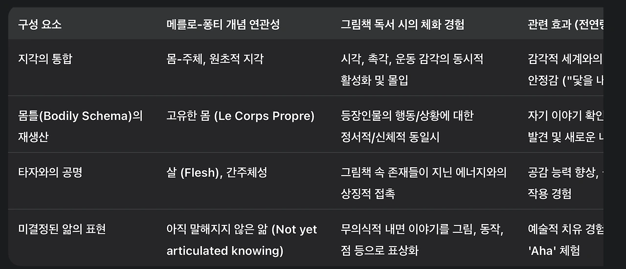 메를로-퐁티의 관점에서, 몸은 생리학적 인과 관계나 욕동의 결과가 아닌 존재의 표현으로 이해되어야 한다. 이 이론적 틀은 그림책 독서 시 발생하는 정서적 동일시와 통찰 을 독자의 고유한 몸(le corps propre)이 세계와 재접촉하는 '체화 인지(Embodied Cognition)'의 결과로 설명할 수 있게 한다. 그림책을 통해 독자에게 전달되는 메시지는 언어적 표상을 넘어, 몸에 각인된 경험과 감각을 직접적으로 불러일으키는 체화 기제를 통해 작동하는 것이다.