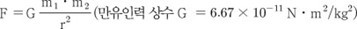 (F=중력, m1, m2는 각 물체의 질량, G=만유인력 상수, r=두 물체의 거리)