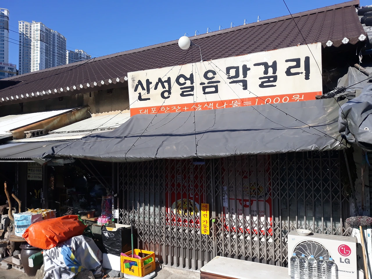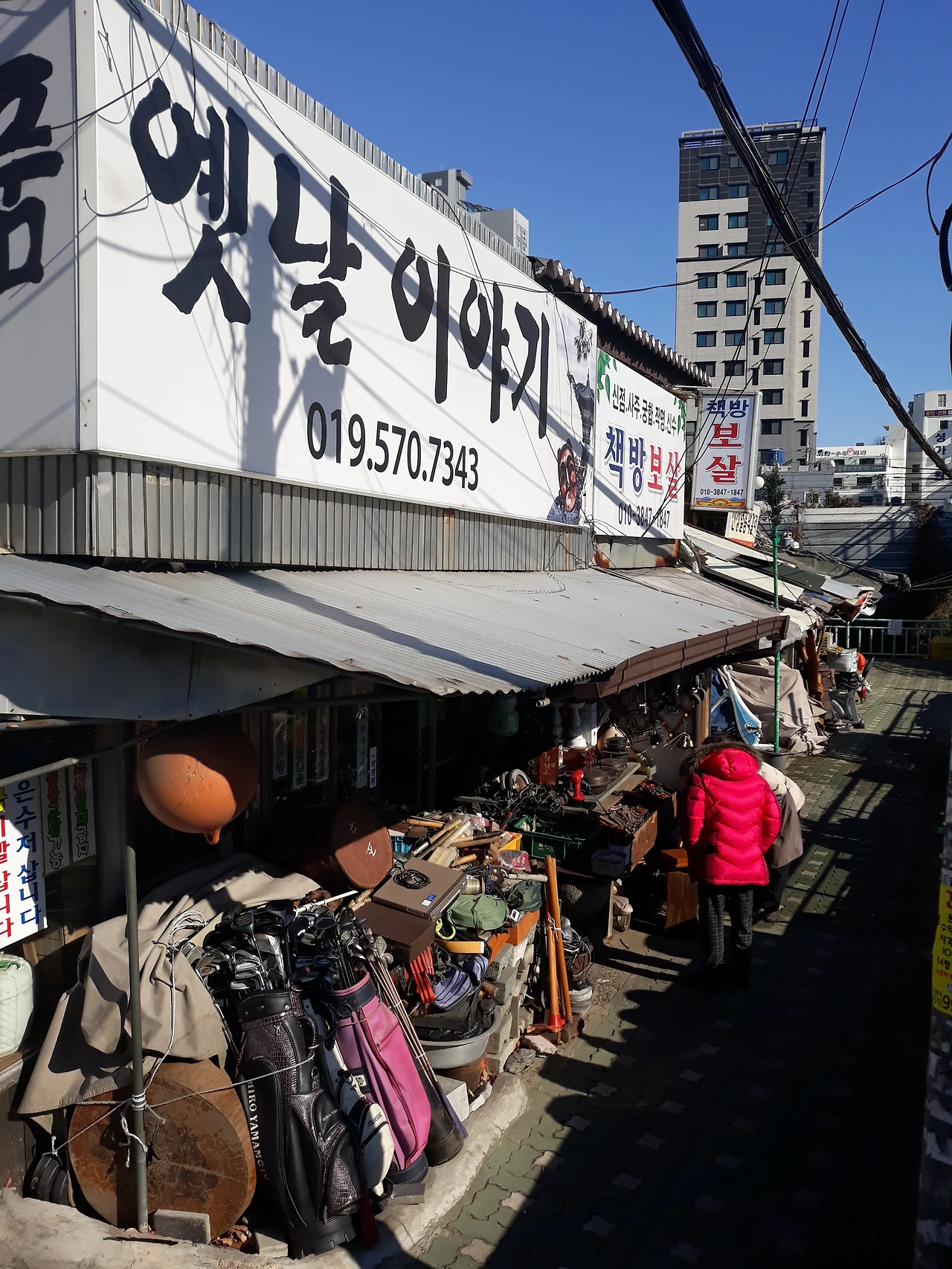 범곡교차로 쪽으로 구름다리를 내려선다. 에어컨 실외기를 빼면 50년의 세월이 고장 난 시계처럼 멈춰 섰다. '산성 얼음 막걸리 대포 한잔 + 삼색나물 = 1,000원'이라고 적힌 간판이 이색적이다.이색적인 간판이 그것만 아니다. 그 옆집은 '책방 보살'이라는 신점, 사주, 궁합을 보는 집이다. 또 그 옆집은 골동품 가게다. 은수저, 금이빨도 산단다. 가게 앞은 골동품 전시장이다. 얼마 전까지 사용하다 버린 물건들을 다 모아 놓았다. 요즘 아이들은 안경을 잃어버려도 찾지 않는다. 다시 사면되니까. 그런데 누가 이런 물건을 사는지 궁금하다. 아예 '옛날이야기'라는 간판을 걸어 놓았다. 제법 흥정하는 손님이 있다.