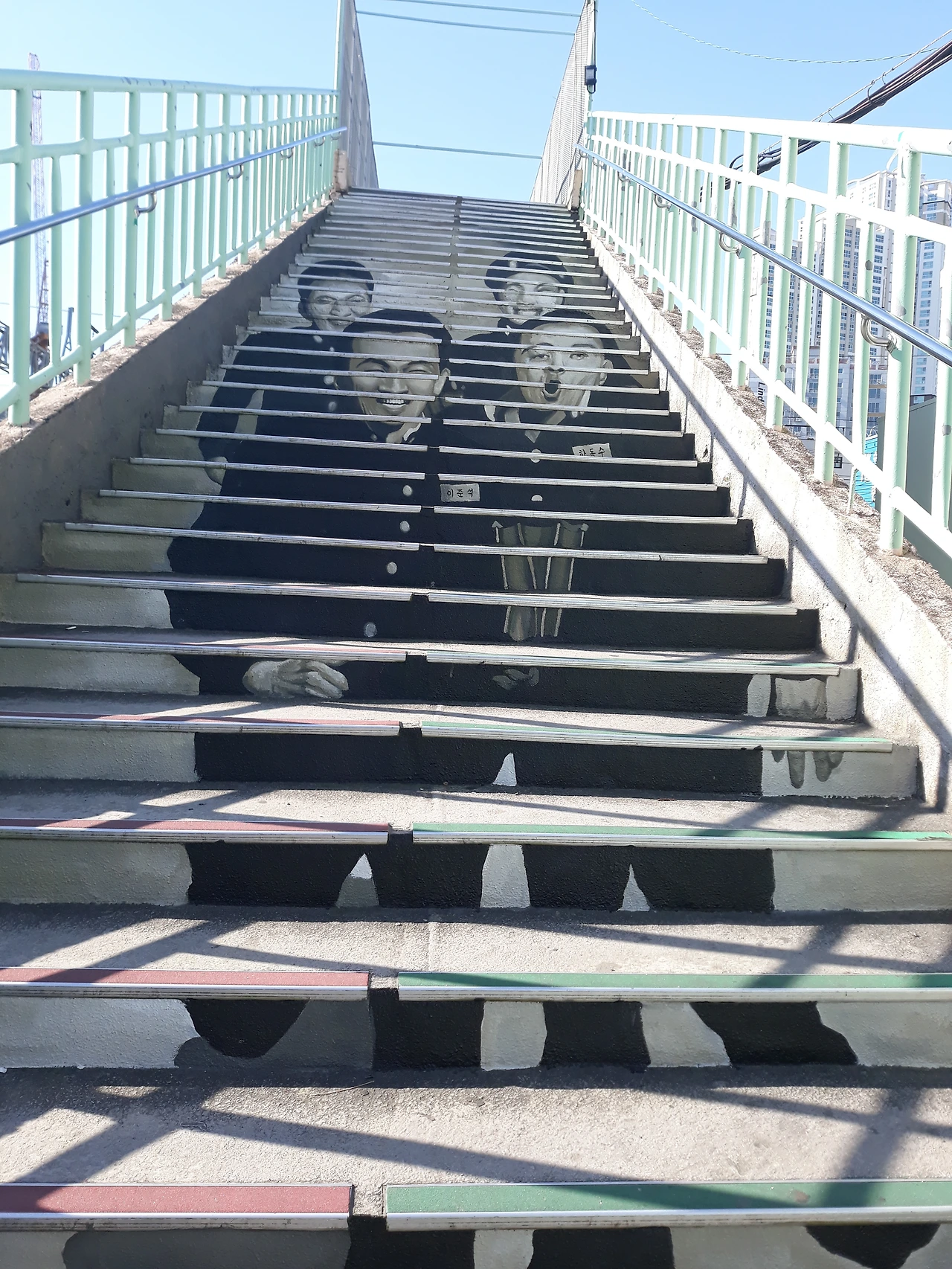 이 길을 '친구의 거리'라 한다. 2001년 영화 <친구>를 촬영한 장소다. 계단에 유오성, 장동건, 정운택, 서태화가 교복을 입고 골목을 누비며 뛰어가는 모습이 그려져 있다. 영화의 장면과 나의 학창 시절 구름다리가 오버랩된다. 삼일극장, 구름다리, 조방 앞을 영화의 주무대로 삼았다. 곽경택 감독이 동구에서 어린 시절을 보낸 것이 동기가 되지 않았겠는가.
