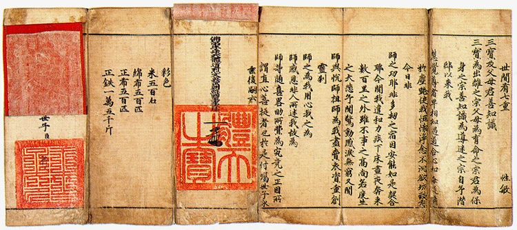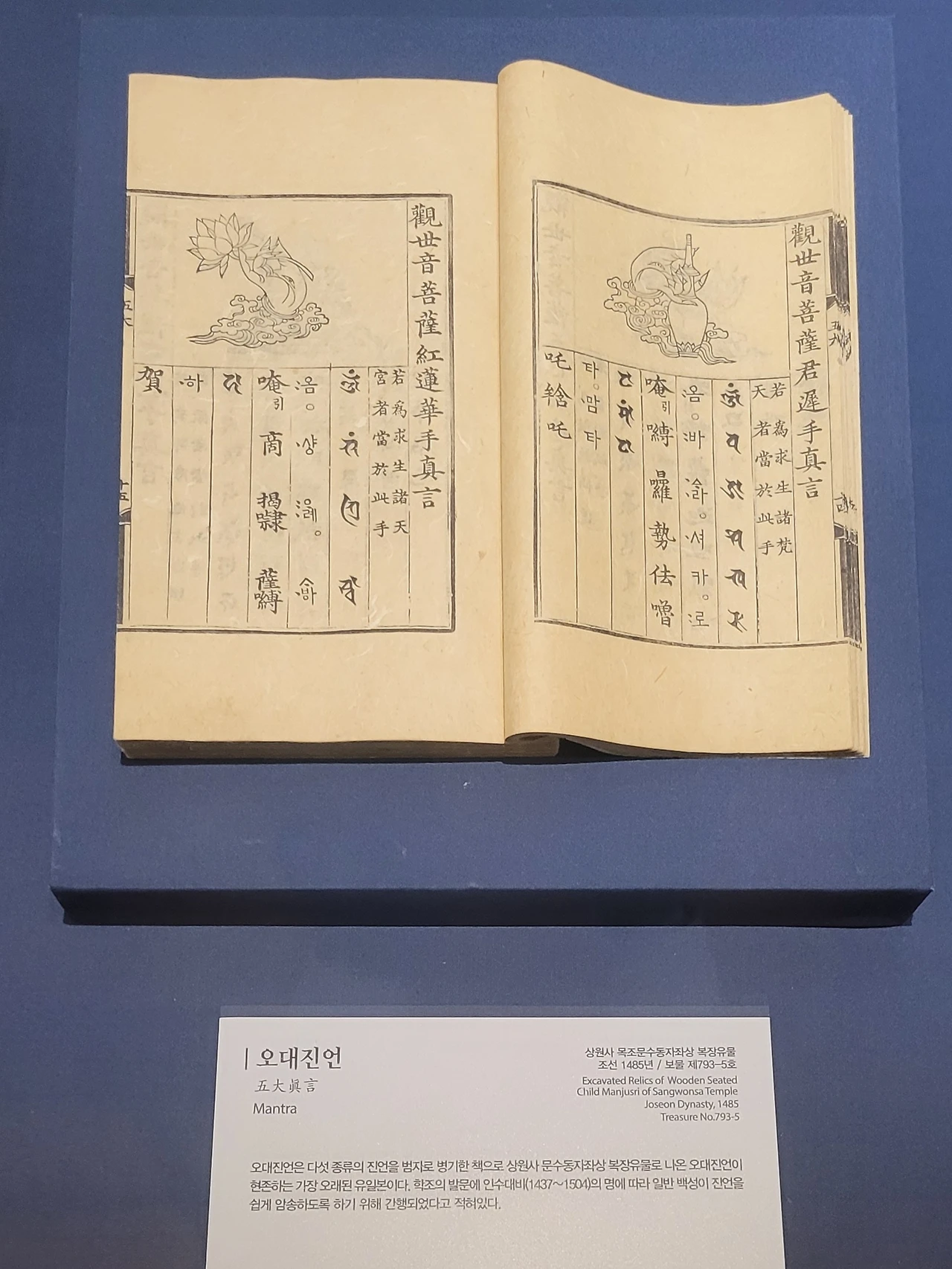 오대전언. 상원사문수동자상 복장에서 나온 오대진언은 인수대비의 명을 받아 백성들이 진언을 쉽게 배울 수 있도록 발간한 책이다. 밀교(7세기 후반 인도에서 성립한 대승 불교의 한 파)의 경전인 다섯 종류의 진언을 범자(梵字)로 적고 한자의 음역을 범문과 언문으로 병기한 후, 그림으로 설명하고 있다.