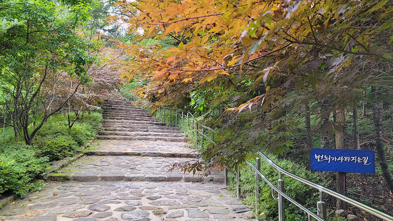 가을의 단풍. 녹색의 싱그러움이 눈을 시원하게 하는 상원사 가는 길은 가을 단풍이 아름답기로 유명하지만 아직 철이 이른다. 붉은 단풍나무와 초록의 나무가 어우러진 '번뇌가 사라지는 길'은 다가올 적멸보궁 오르는 길을 예고하는 듯하다