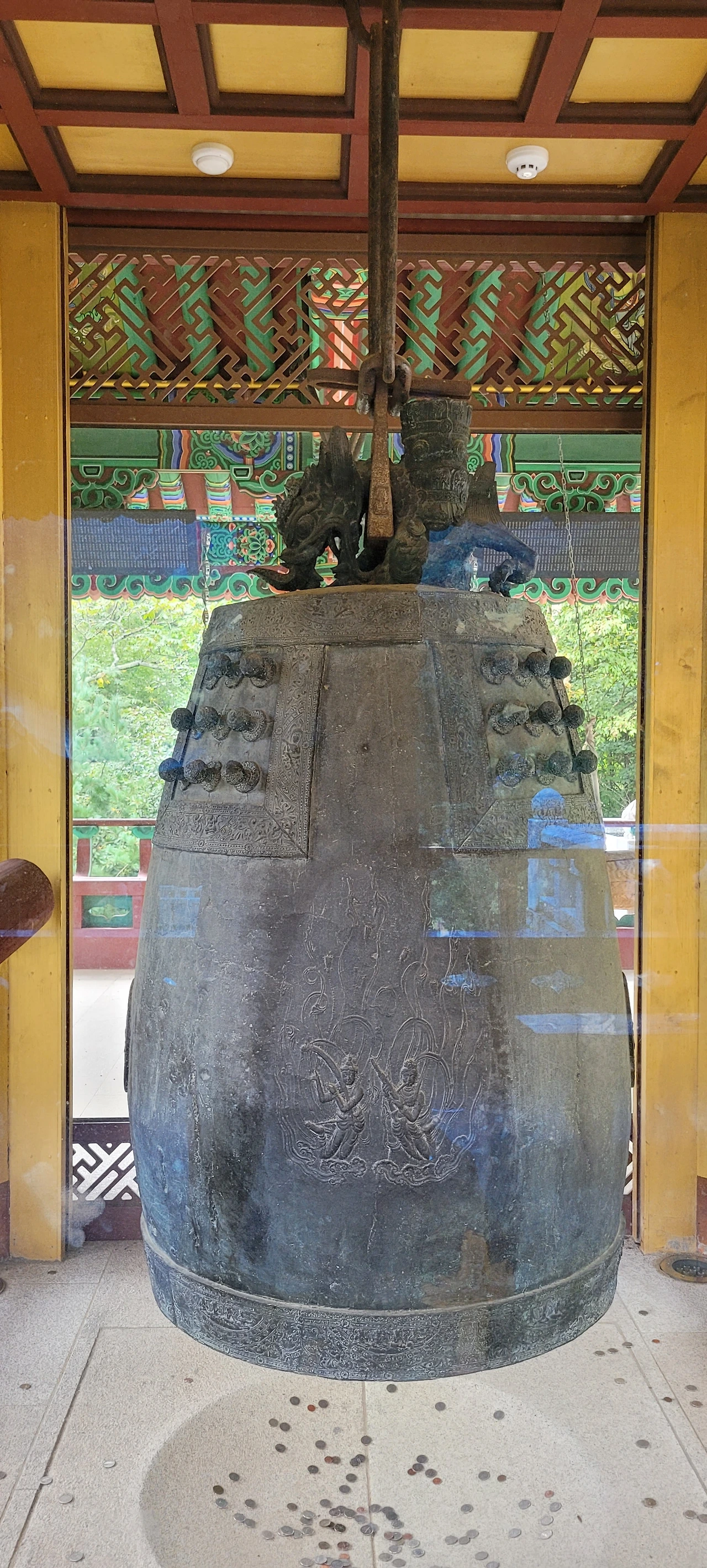 유리 칸막이로 보존하고 있는 것이 국보인 진품이고, 오른쪽은 복제품, 왼쪽은 범종에 새겨진 비천상을 양각한 조각상이다.