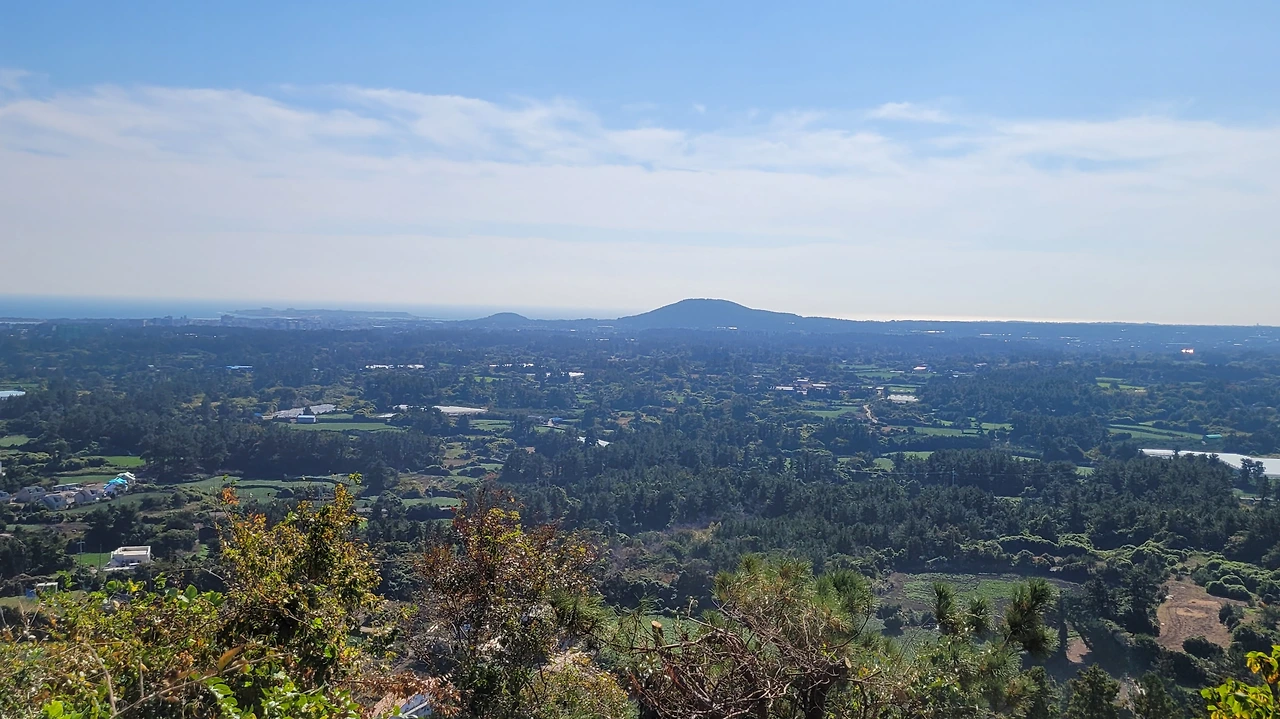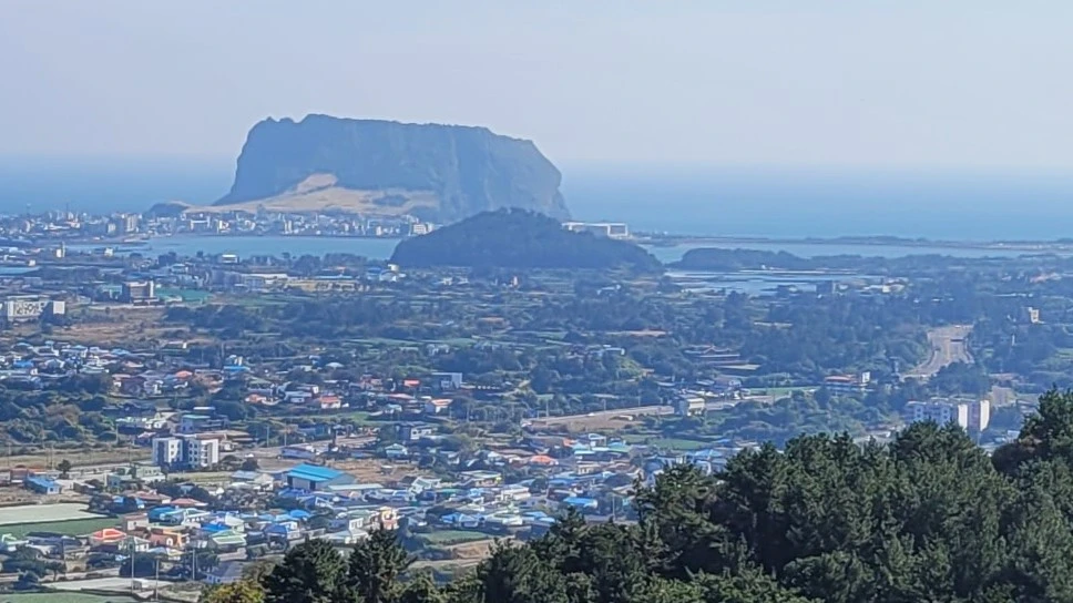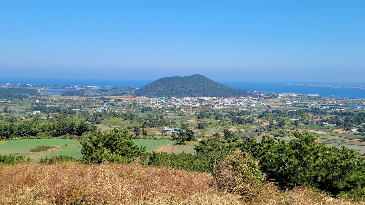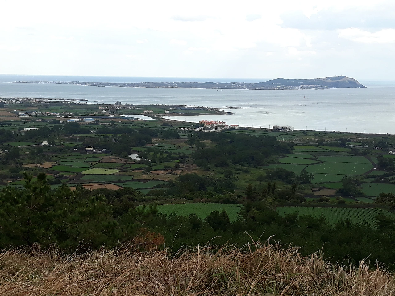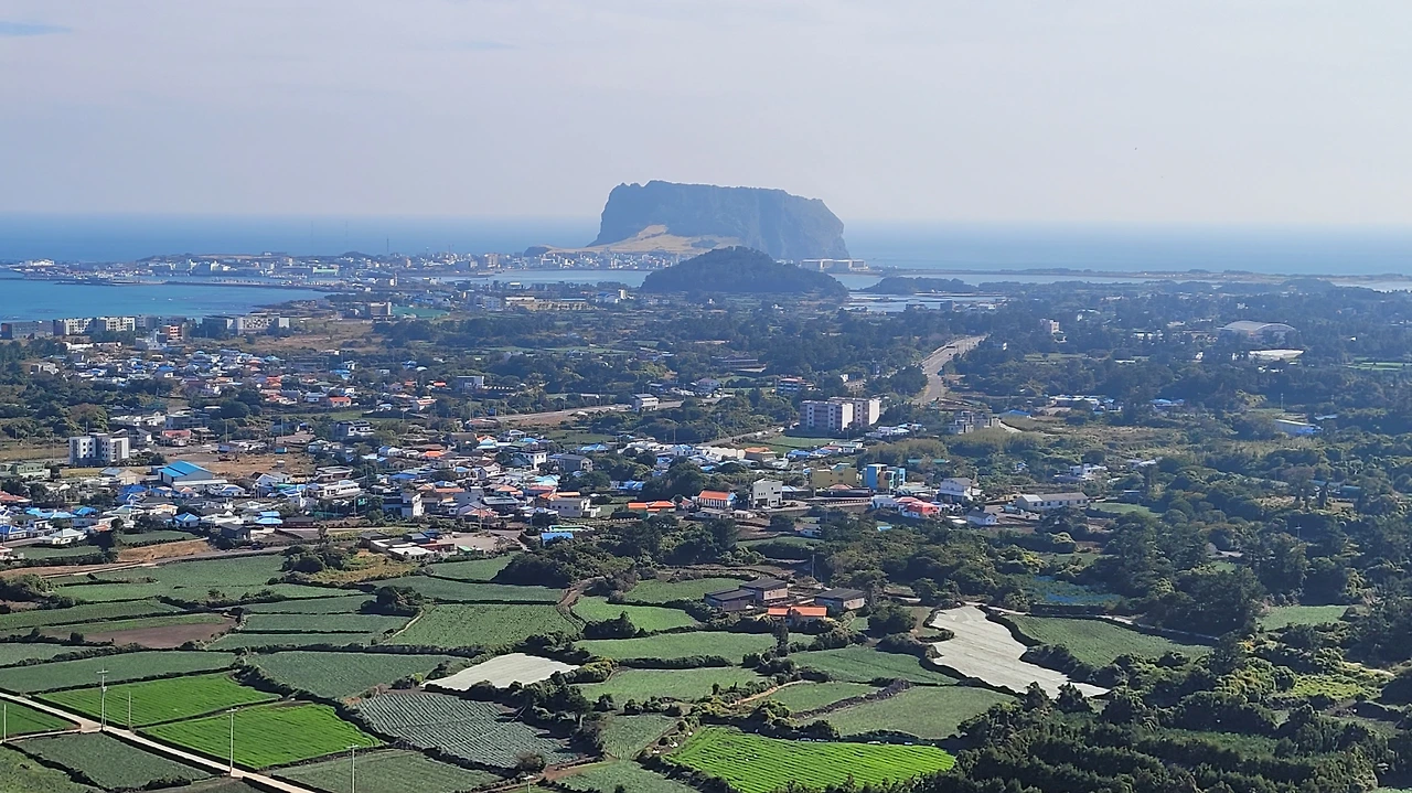 시흥리 들판, 오조마을 내수면과 식산봉, 성산일출봉과 성산항이 보인다.