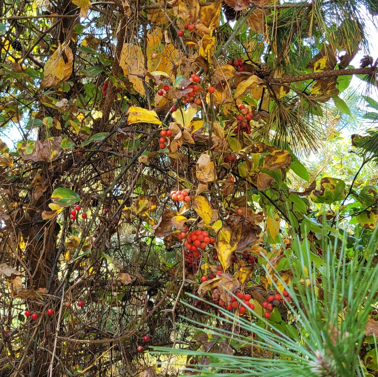 영남 지방에서 보통 망개나무라고 부르는 청미래덩굴이 소나무를 감고 올라 뒤엉켜 있다. 의령의 특산물인 망개떡을 싼 싸개가 이 나무의 잎이다. 옛날 늦은 밤, 망개떡 장사가 외치던 '망개떡 사려, 망개~떠어억'하는 소리가 생각난다. 잎은 낙엽이 지고 열매가 빨갛게 익었다.