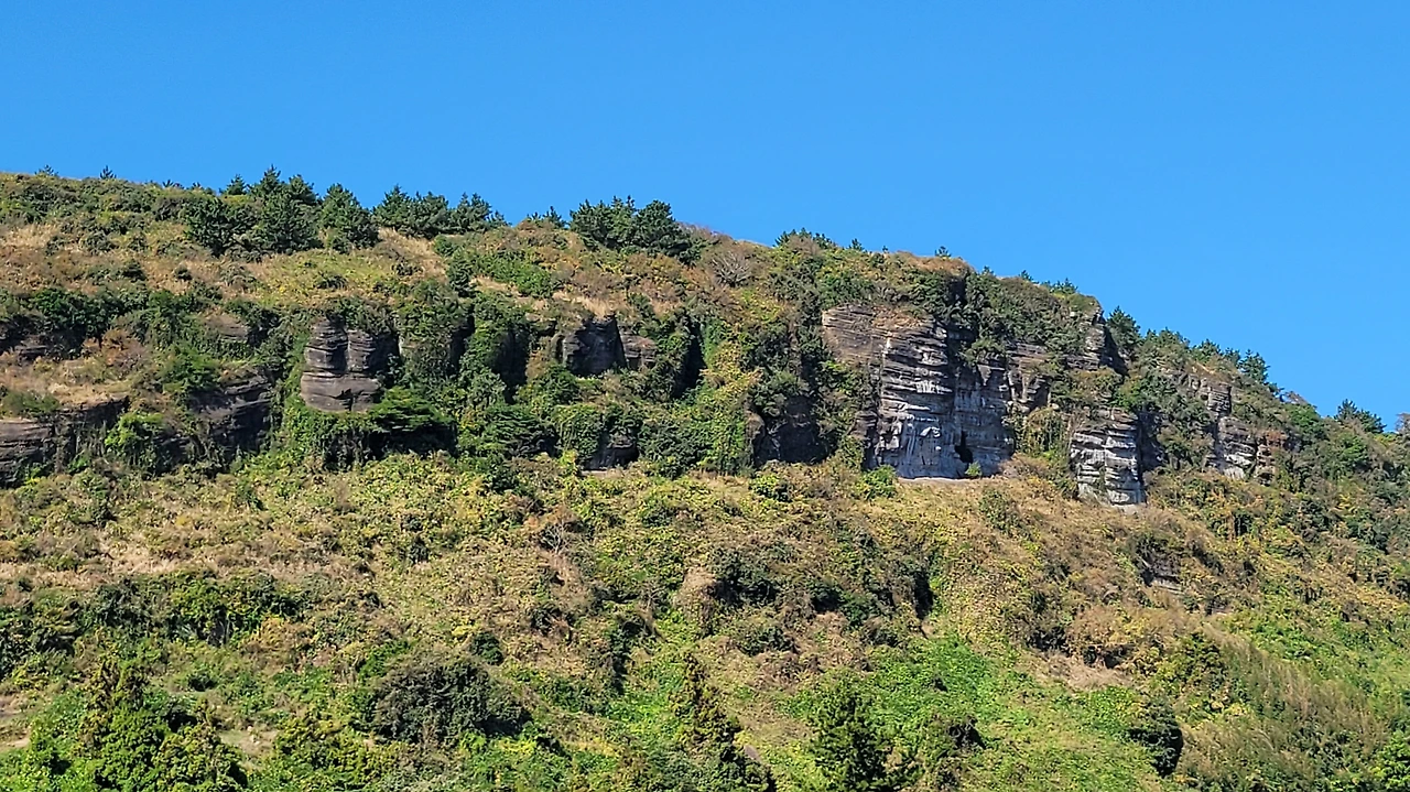 외륜산 화구벽. 경사가 만만치 않지만 오르막이 길지는 않다. 300m쯤 오르면 외륜산 화구벽에 올라선다. 능선 길 북쪽은 굼부리다. 굼부리 안쪽의 비탈진 곳에 소나무가 빽빽하게 들어서 있다. 능선 길 남동쪽은 화구벽이 절벽을 이루고 있다.