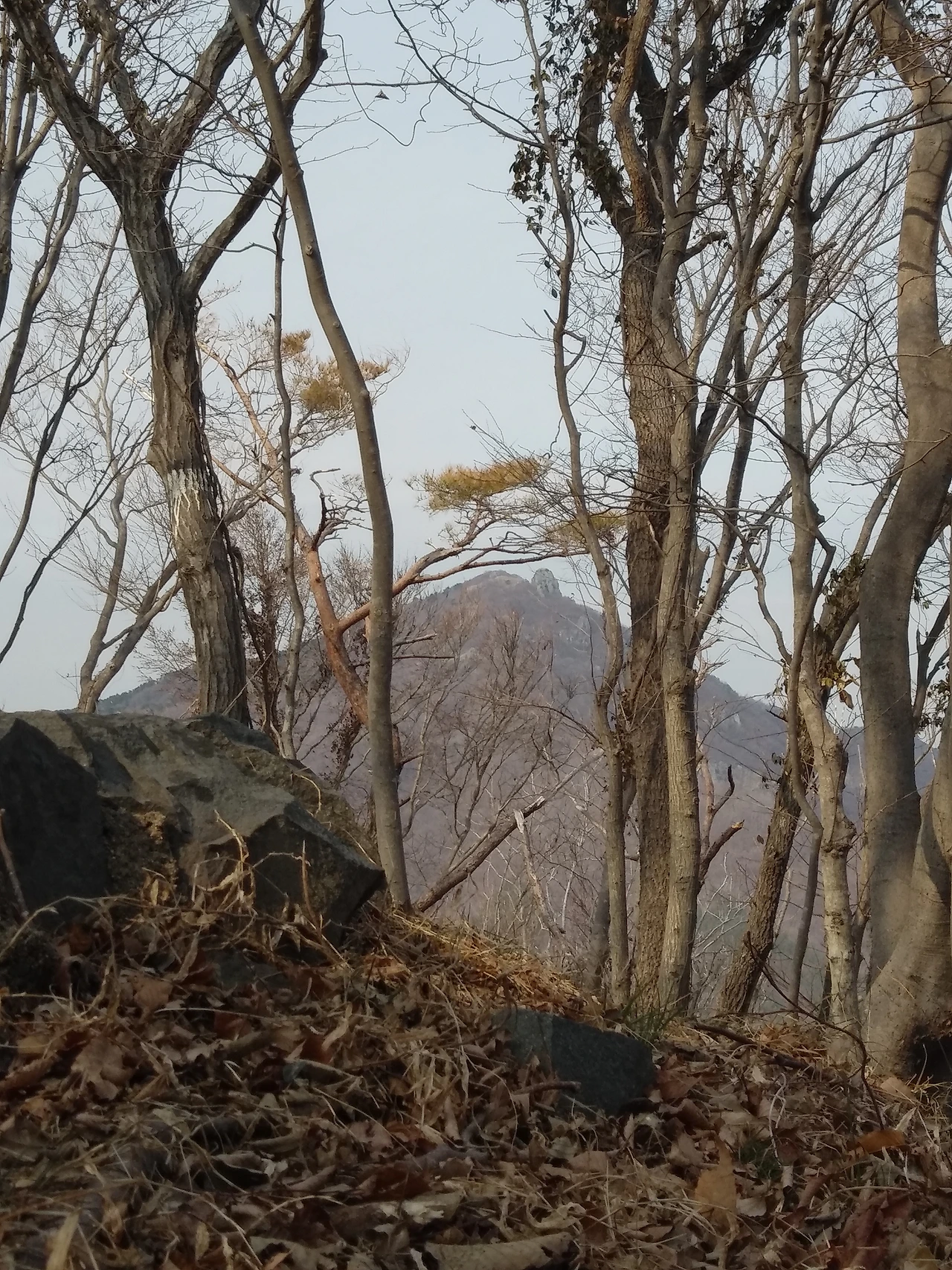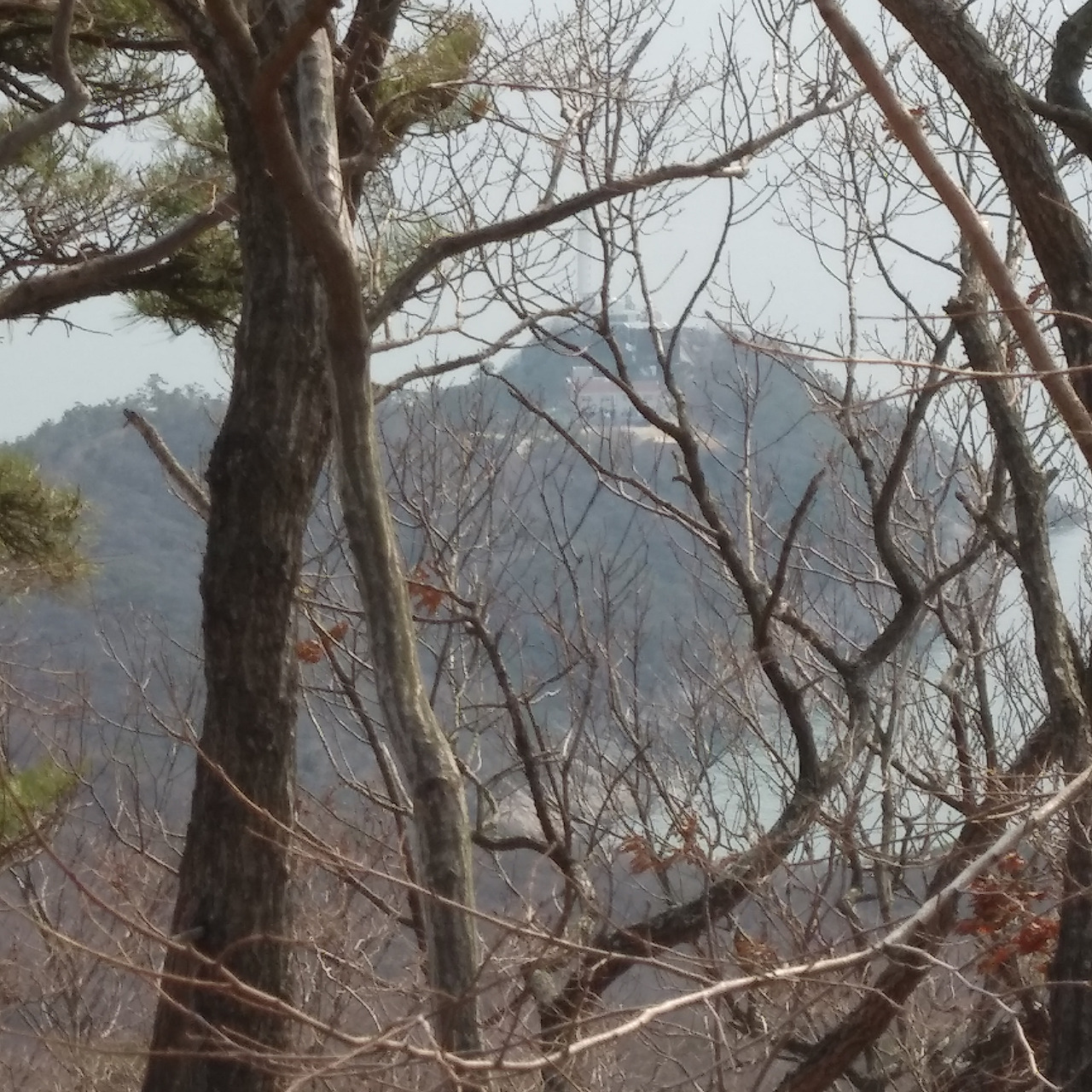 나뭇가지 사이로 멀리 연대봉이 보인다. 연대봉에는 임진왜란 때 대마도에서 부산포로 침략해오는 왜군 함대를 최초로 발견하고 보고한 봉수대가 있다.
