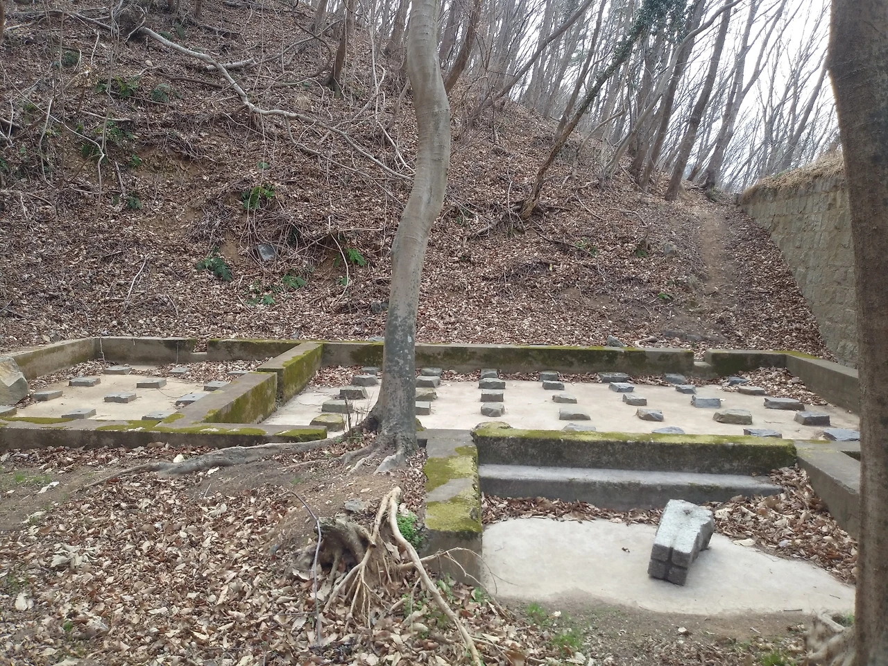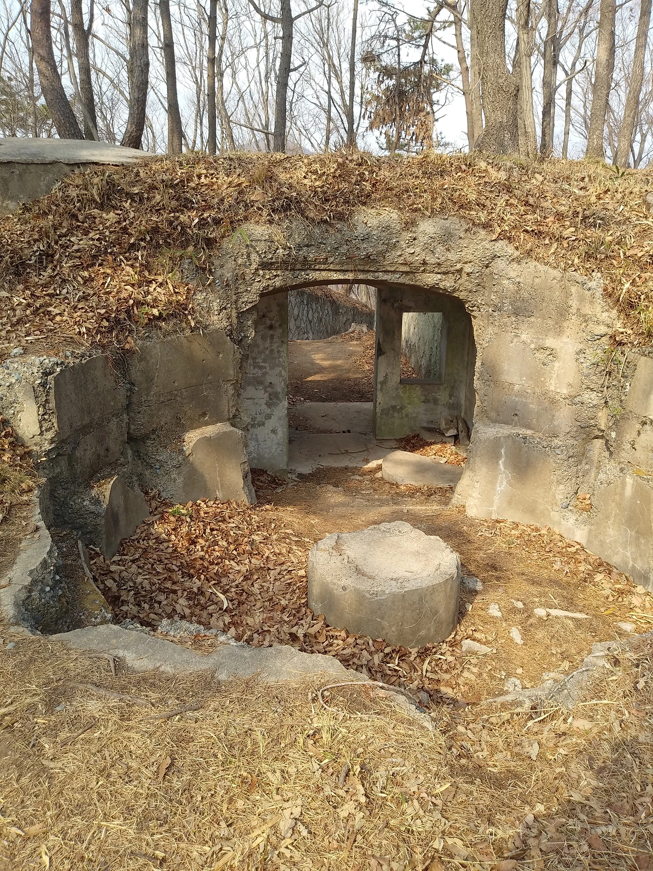 산 옆을 돌아 화약고 터를 다녀온다. 일본군이 군사시설로 설치하여 화약고로 사용하던 곳으로 현재 건축물은 없고, 콘크리트 줄기초만 남아 있다. 줄기초의 우측면이 화강암 석축으로 형성된 것으로 미루어 봐서 나머지 면도 석축이 쌓여 있었던 것으로 추정된다고 현지 안내문은 설명하고 있다.