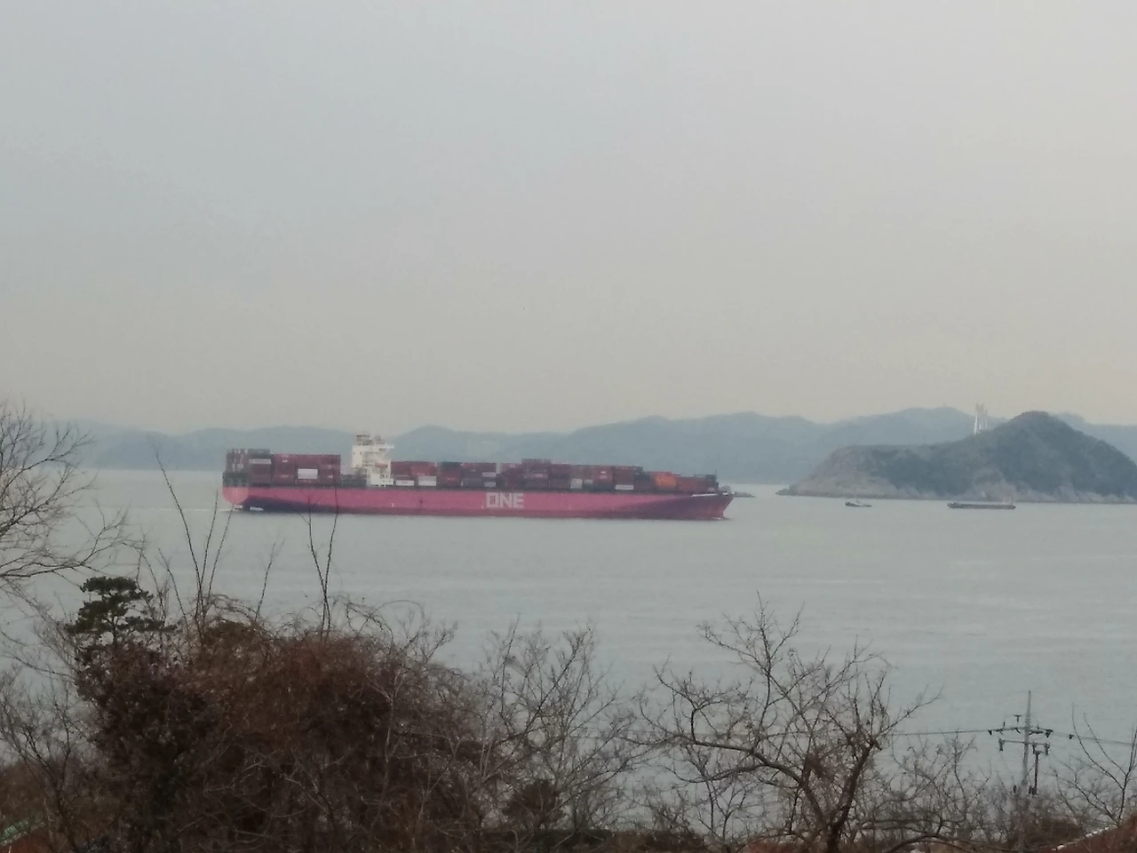 '수리산 만디이'로 올라가면서 포진지 전경과 외양포 마을을 돌아본다. 외양포 앞바다에 신항으로 들어가는 화물선이 계속 지나간다.