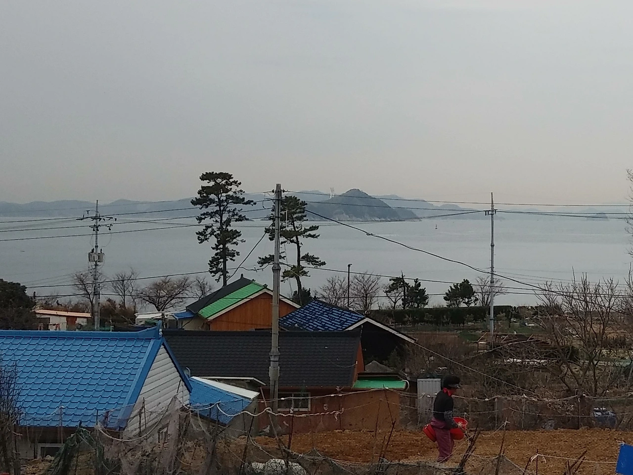 마을의 끝머리에 아낙네가 파종을 위해 밭을 손질하고 있다. 앞바다에는 대죽도가 떠 있고 뒤로 저도, 거제도 본섬이 보인다. 오른쪽 바다 밑으로 침매터널이 지나간다.