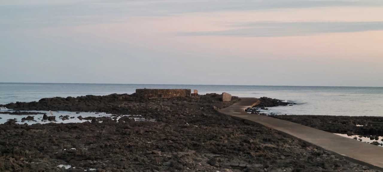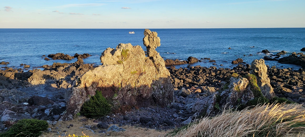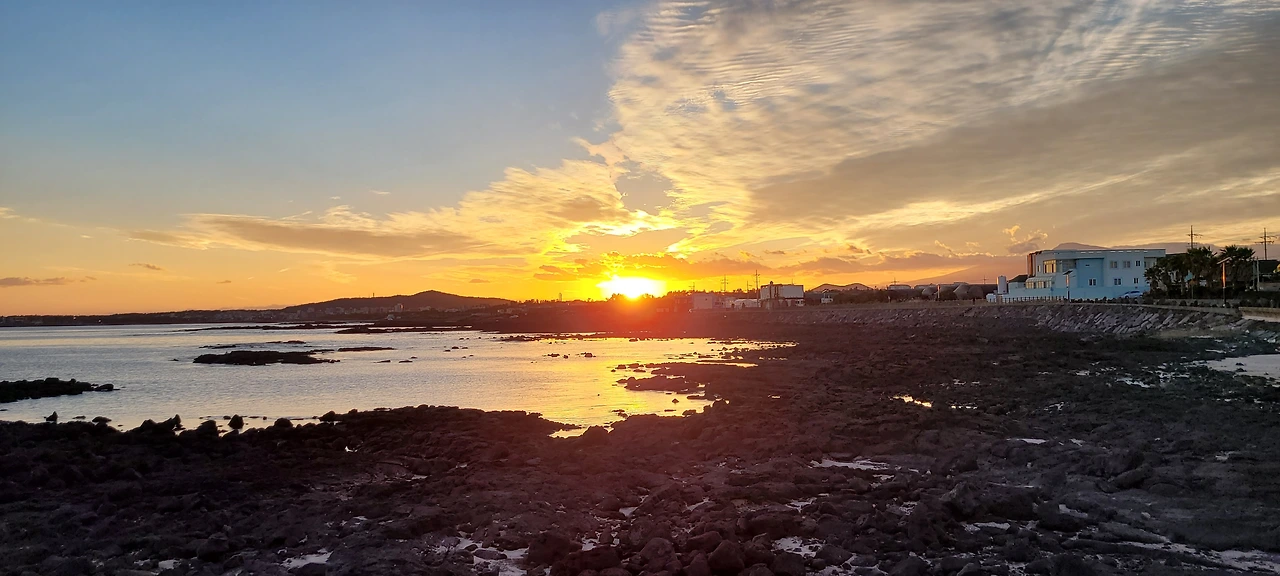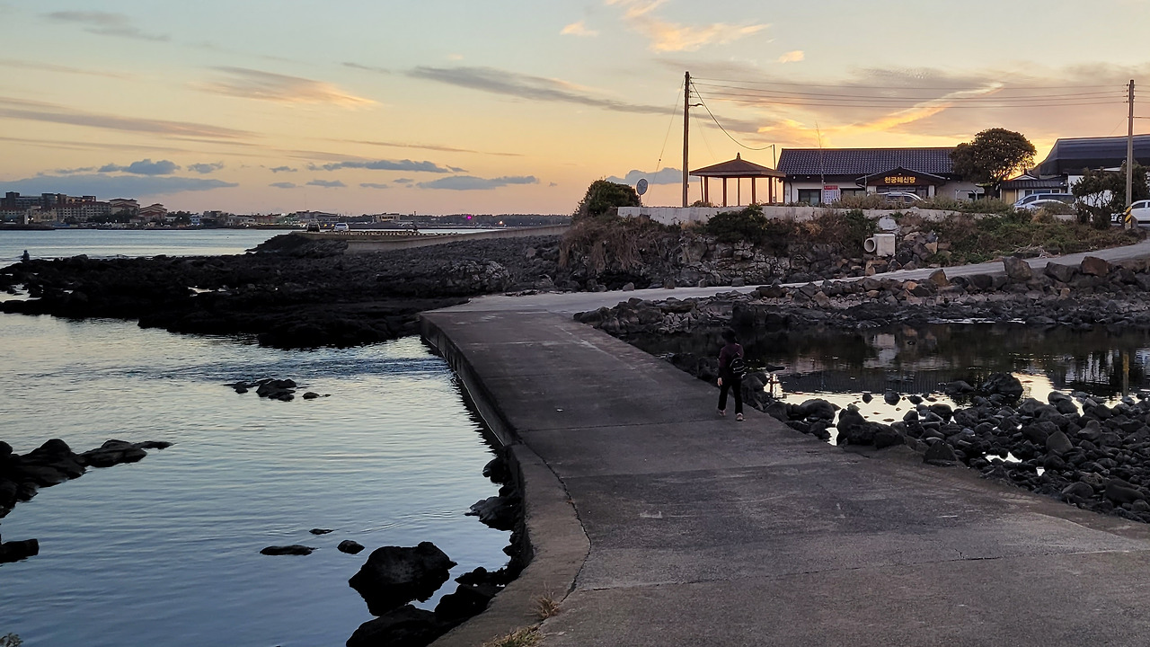해변은 현무암의 검은여가 넓게 펼쳐진다.