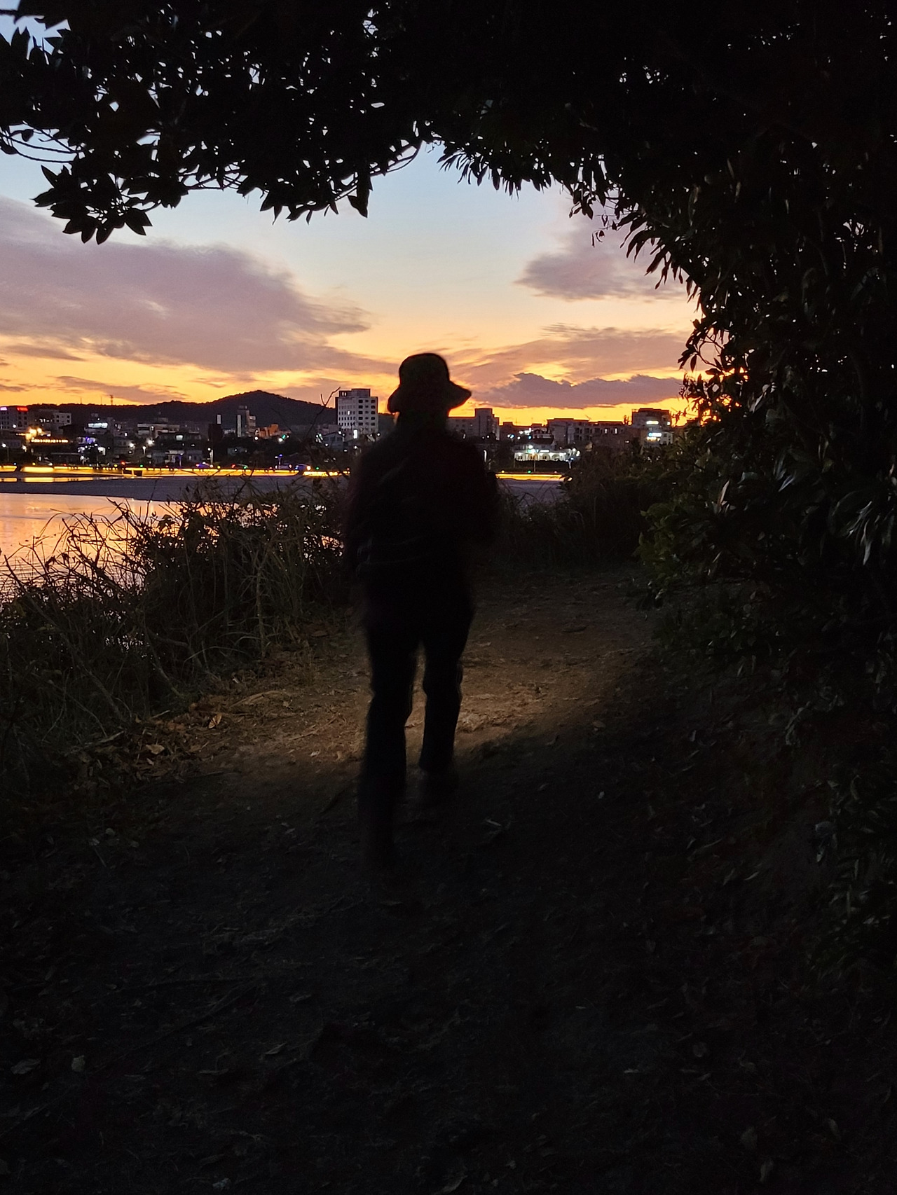 돈나무, 굴거리나무, 까마귀쪽나무, 우묵사스레피가 뒤얽힌 상록 활엽수가 우거진 숲 속으로 들어간다. 서쪽 하늘이 붉게 타오르는 듯하더니 금세 날이 완전히 어두워졌다. 핸드폰 플래시를 켜고 걷는다.