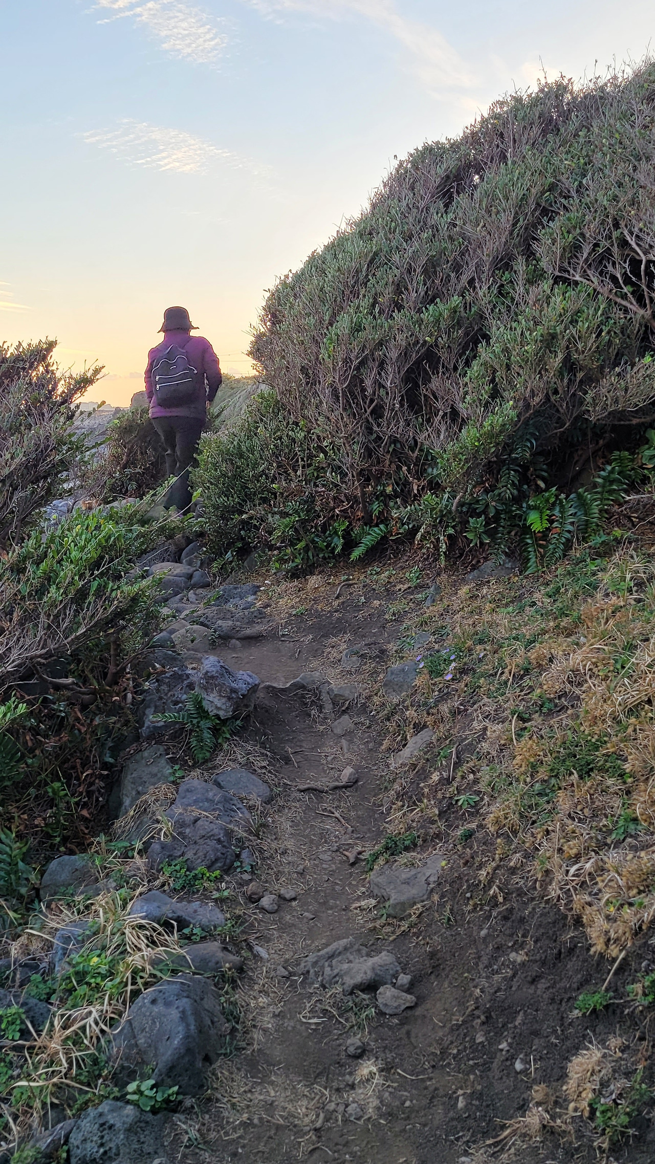 해변에서 언덕 위로 올라선다. 드라이브하던 사람들이 해안도로가에 차를 대어놓고 해 떨어지는 것을 기다린다.