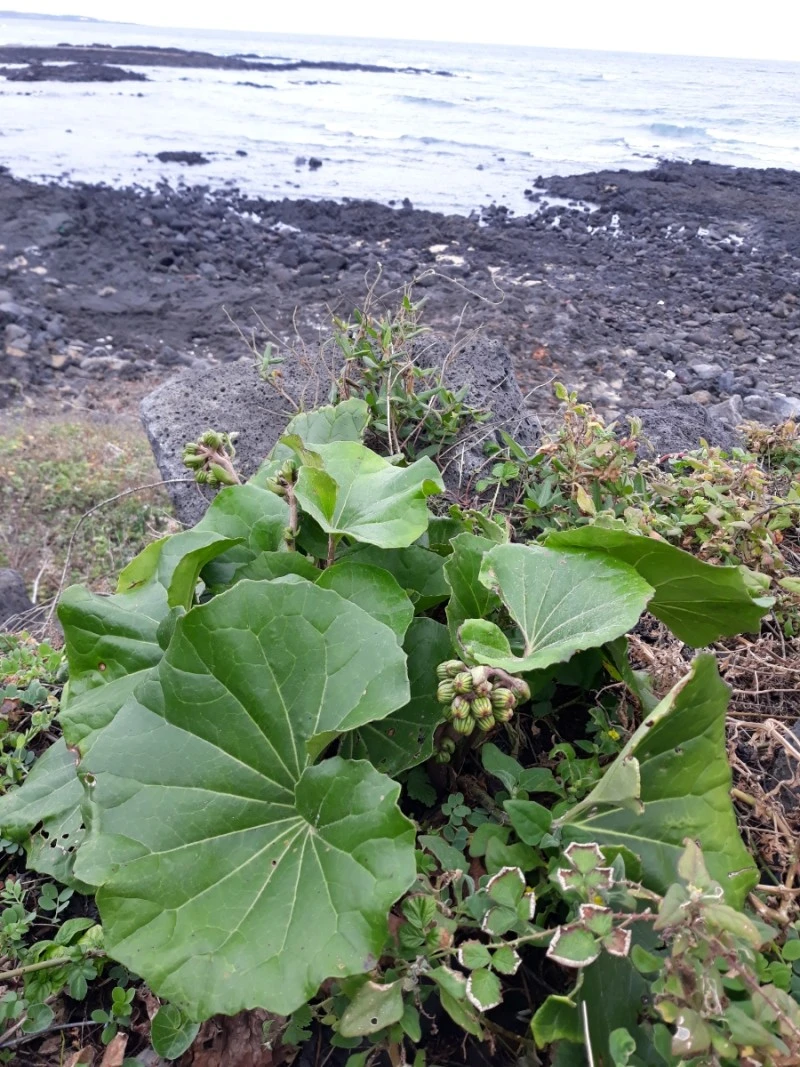털머위. '한결같은 마음'으로 제주도 전역에 무더기로 피어 있는 털머위는 '다시 찾은 사랑'을 위해 갯강활과 임무 교대한 것 같다. 해안을 독차지하고 있다.
