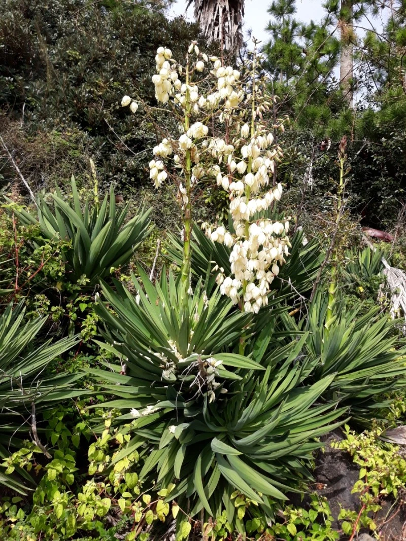 유카. 흰색 꽃이 아래로 향해 반쯤 열려 있는 유카가 여러 갈래로 갈라진 가지에 많은 꽃을 달고 있다.