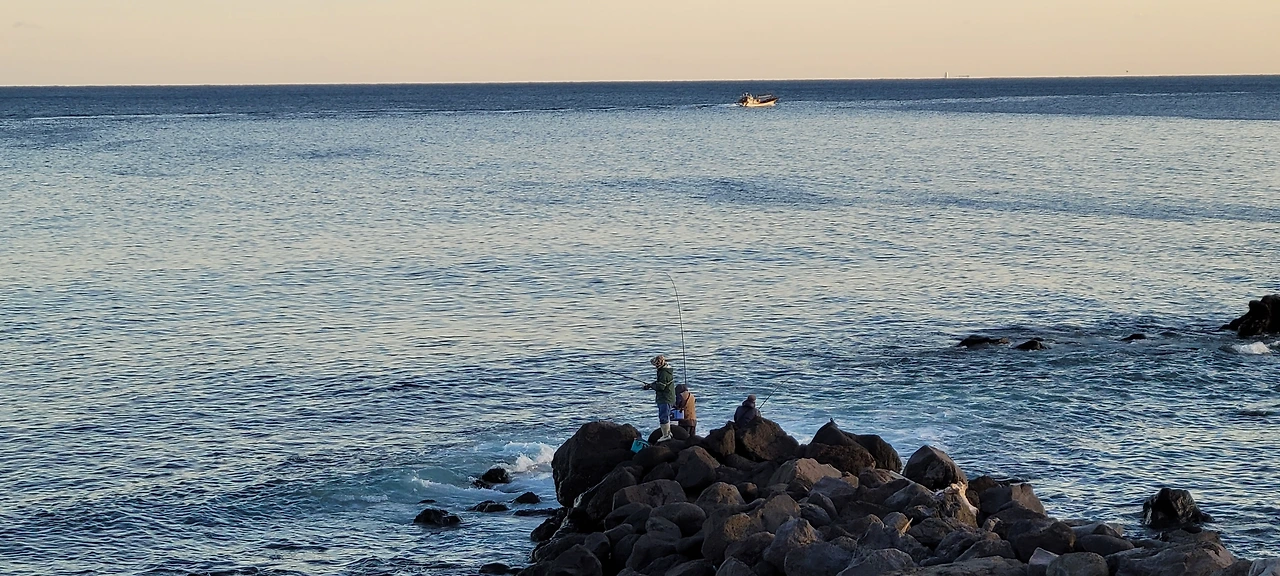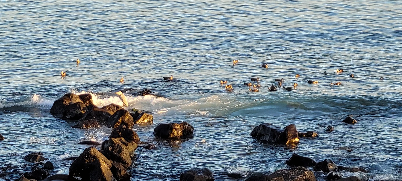 멀리 갯바위에 낚시하는 사람들의 모습도 그림처럼 보인다. 갯바위에 앉아 있는 낚시꾼의 모습이, 해질녘인데도 집을 찾아가지 않고 모여 있는 철새 떼와 다를 게 없다.
