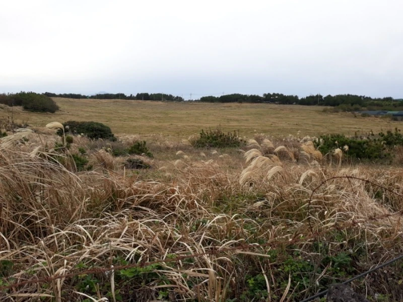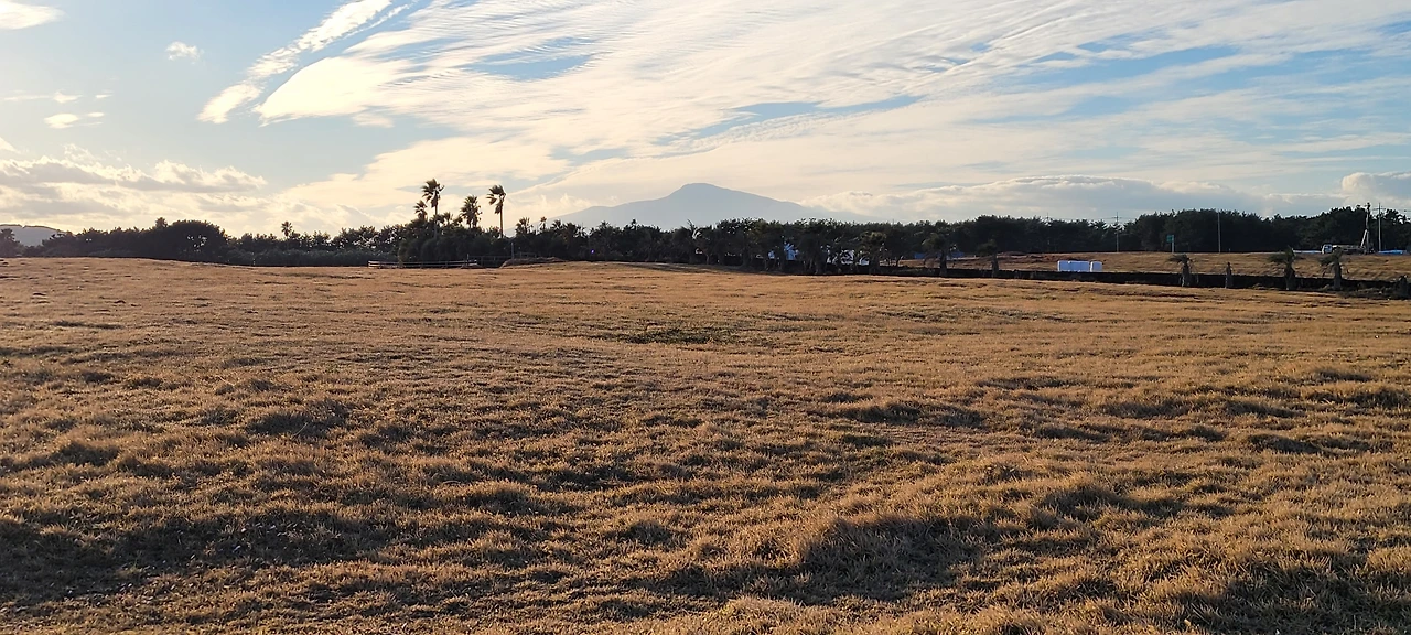 신풍리와 신천리 해변의 오른쪽으로 약 10만 평의 넓은 초원이 펼쳐진다. 초원 너머로 한라산이 모습을 드러낸다.