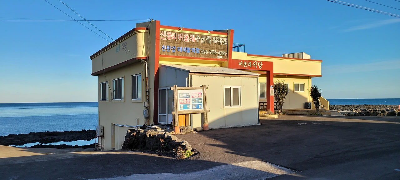 무밭 너머로 태양광 발전 시설이 있다. 바람이 잘 통하게 쌓은 돌담을 따라가면 일주동로를 만난다. 신풍 교차로를 건너 신풍 포구로 내려선다. 어촌계 식당 앞에서 올레B코스와 합류한다.