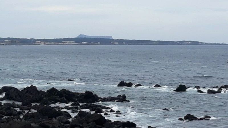 바다목장. 남은 길은 해변을 따라 이어진다. 뒤를 돌아본다. 푸른 바다 건너 성산일출봉이 모습을 드러낸다.